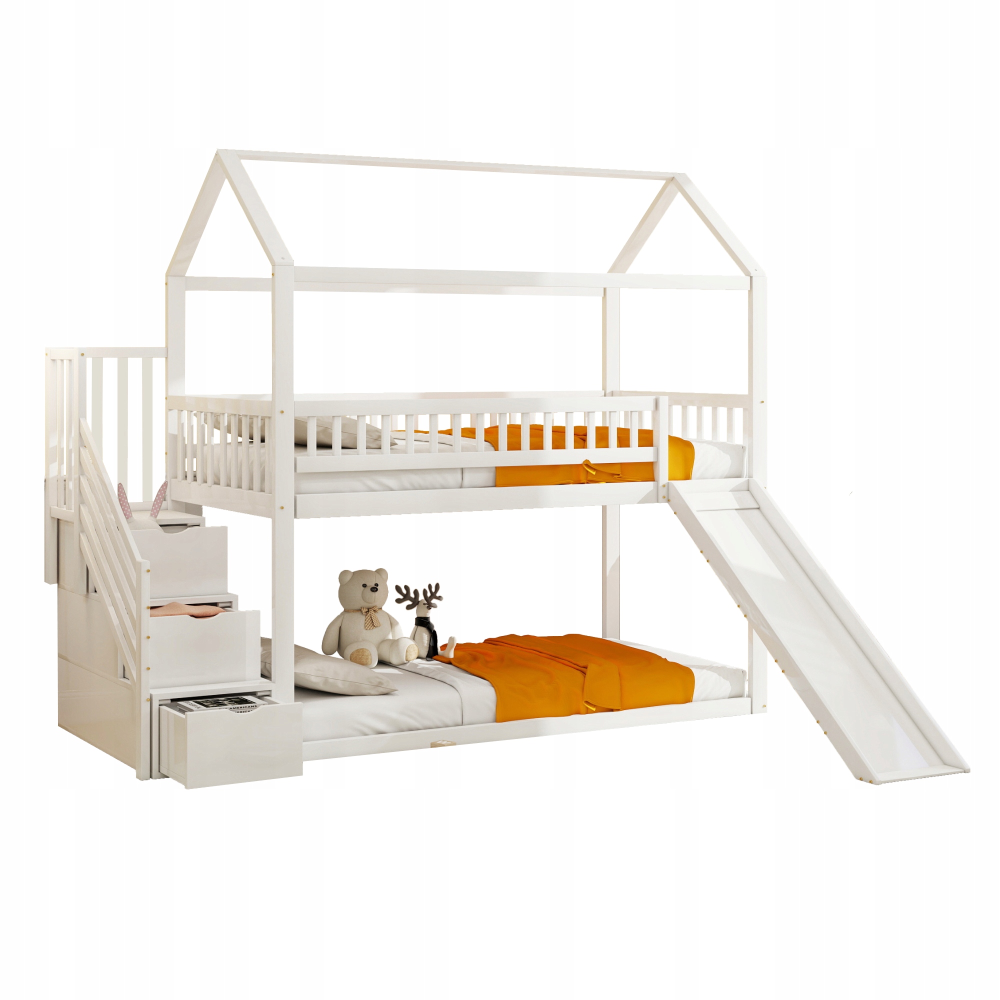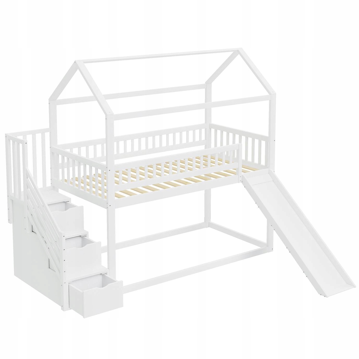 Bunk Bed для детей 90*200 см, двухъярусная кровать, с слайдом и лестницей для хранения, высокий дизайн забора, сплошная деревянная кровать, рама сланцев, белый, белый