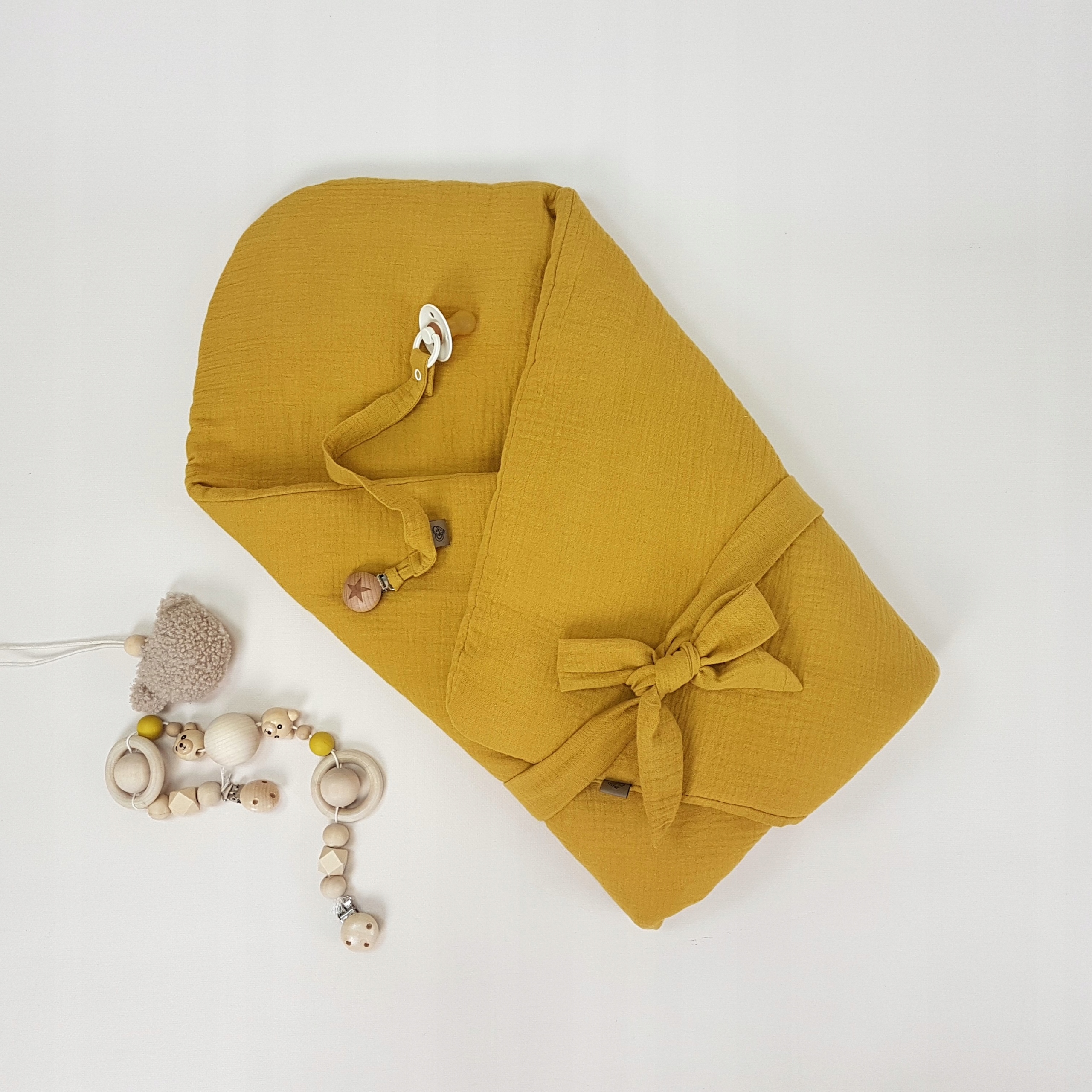 Пеленка изготовлена из хлопкового муслина и мягкого антиаллергенного наполнителя. Завязывается поясом, поэтому его можно легко подогнать под размер ребенка.