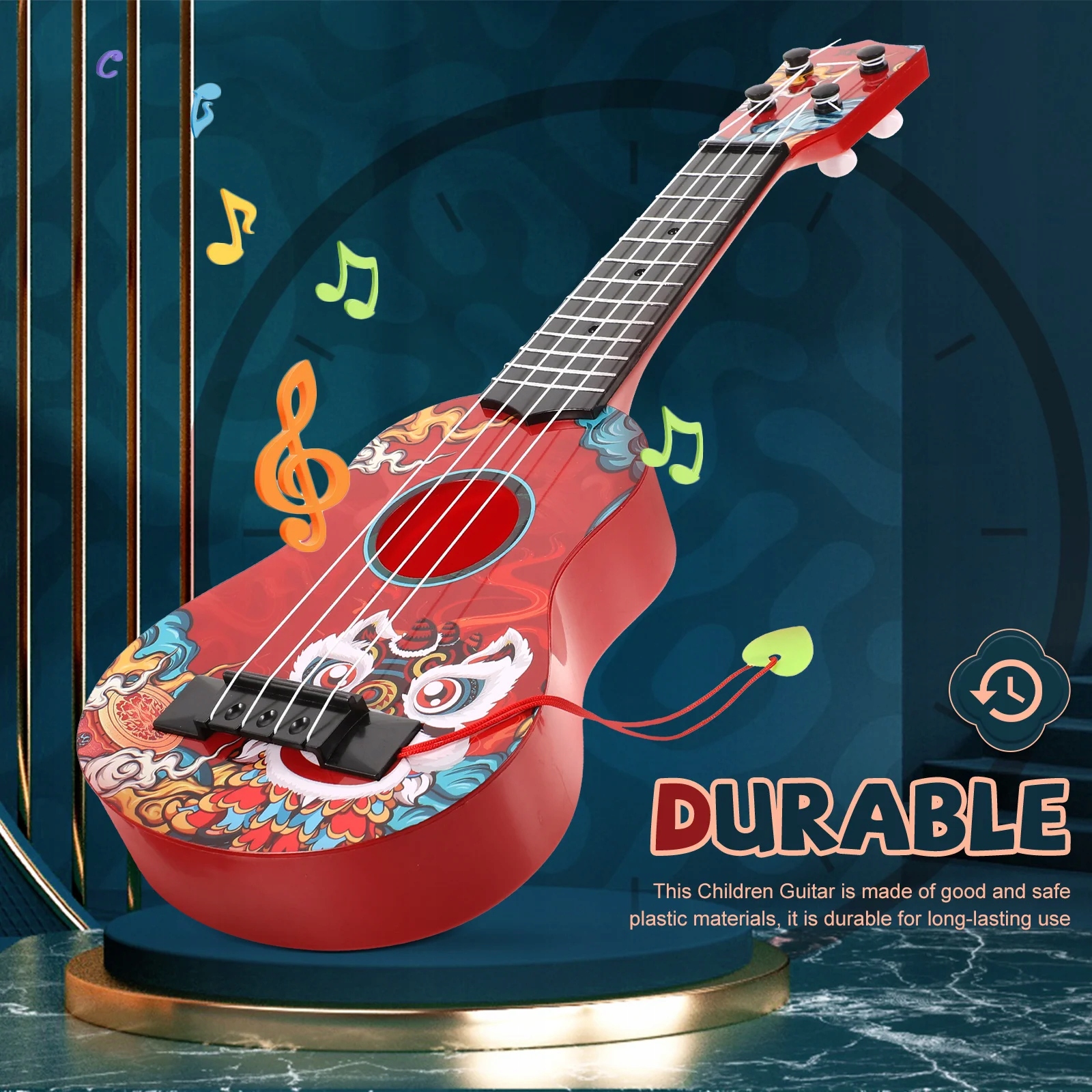 Эта детская гитара изготовлена из хорошего и безопасного пластика, рассчитана на длительное использование