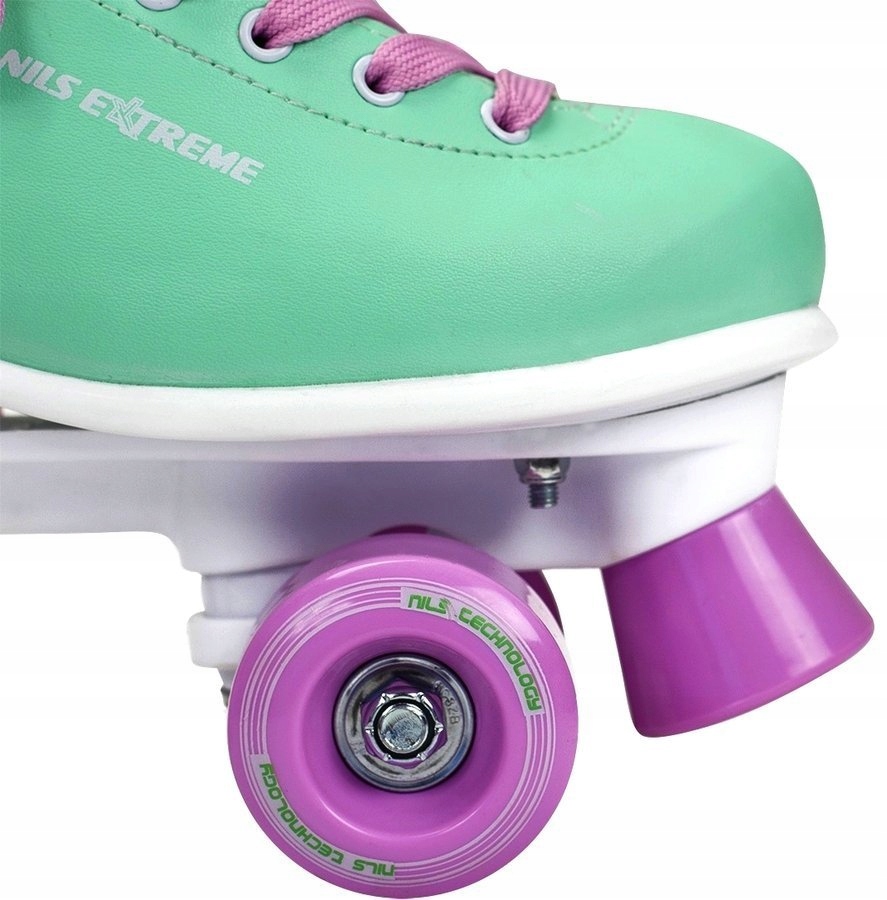 NQ8400 Nils Extreme — роликовые коньки мятного цвета, предназначенные для любительского катания. Они изготовлены из высококачественной синтетической кожи, гарантирующей долговечность в течение длительного времени использования.