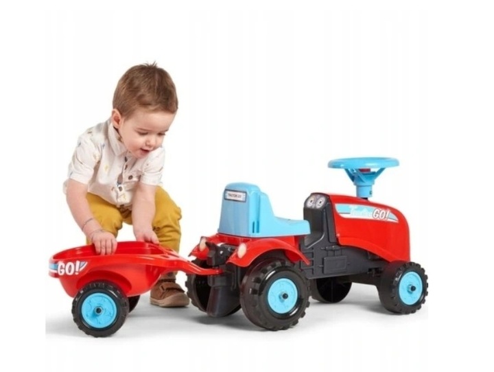 Его яркие цвета стимулируют детское любопытство, а сама игрушка способствует развитию моторики и чувства равновесия. Тщательно спроектированный трактор оснащен рулевым колесом с звуковым сигналом. Подходит как для сада, так и для дома. Входящий в комплект прицеп позволяет детям перевозить мягкие игрушки из комнаты в комнату или перевозить песок или листья в саду. Благодаря входящим в комплект наклейкам вы сможете самостоятельно изменить внешний вид трактора!