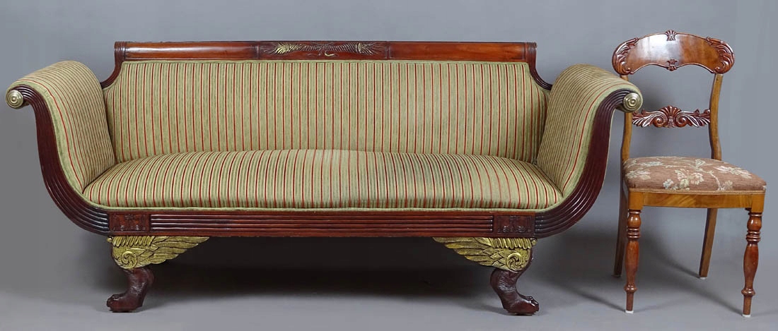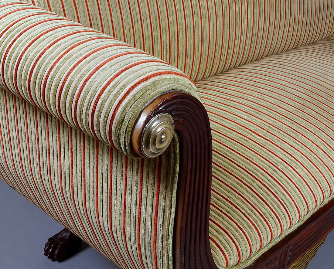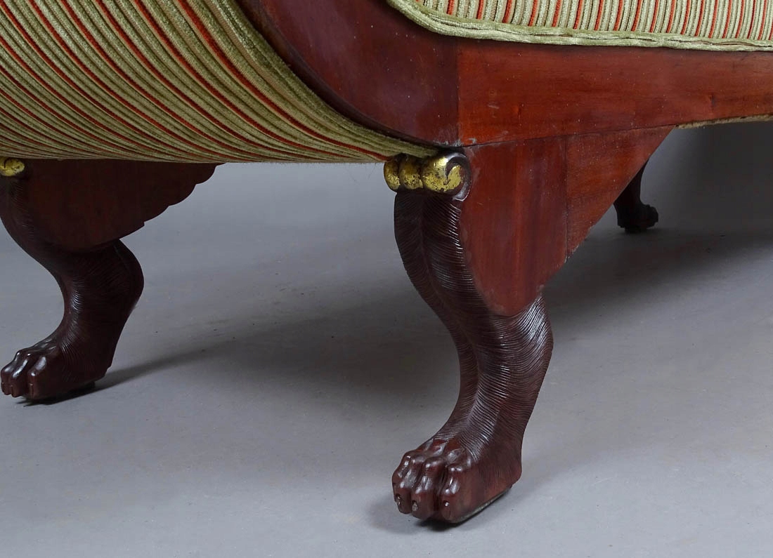 с обившим сиденьем, спиной и сторонами, также сзади, поддерживаемые на четырех массивных ногах в виде лап львов и крыльев выше. Сиденье с материалом, расположенным на полосе движения с пружинами, спинкой с деревянной, резной, слегка разграбленной назад, частично с золотой рамой, с круглыми фитингами по бокам. Стороны открылись на улице, с канюлированными рамами и латунными приложениями на концах. Чистая обивка, без ссад.