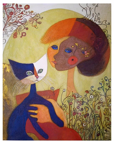 Картина Девушка с котами, написана матовыми и металлизированными акварельными красками, на акварельной бумаге Happy Color плотностью 250г/м2. В зависимости от угла освещения краска становится металлической.