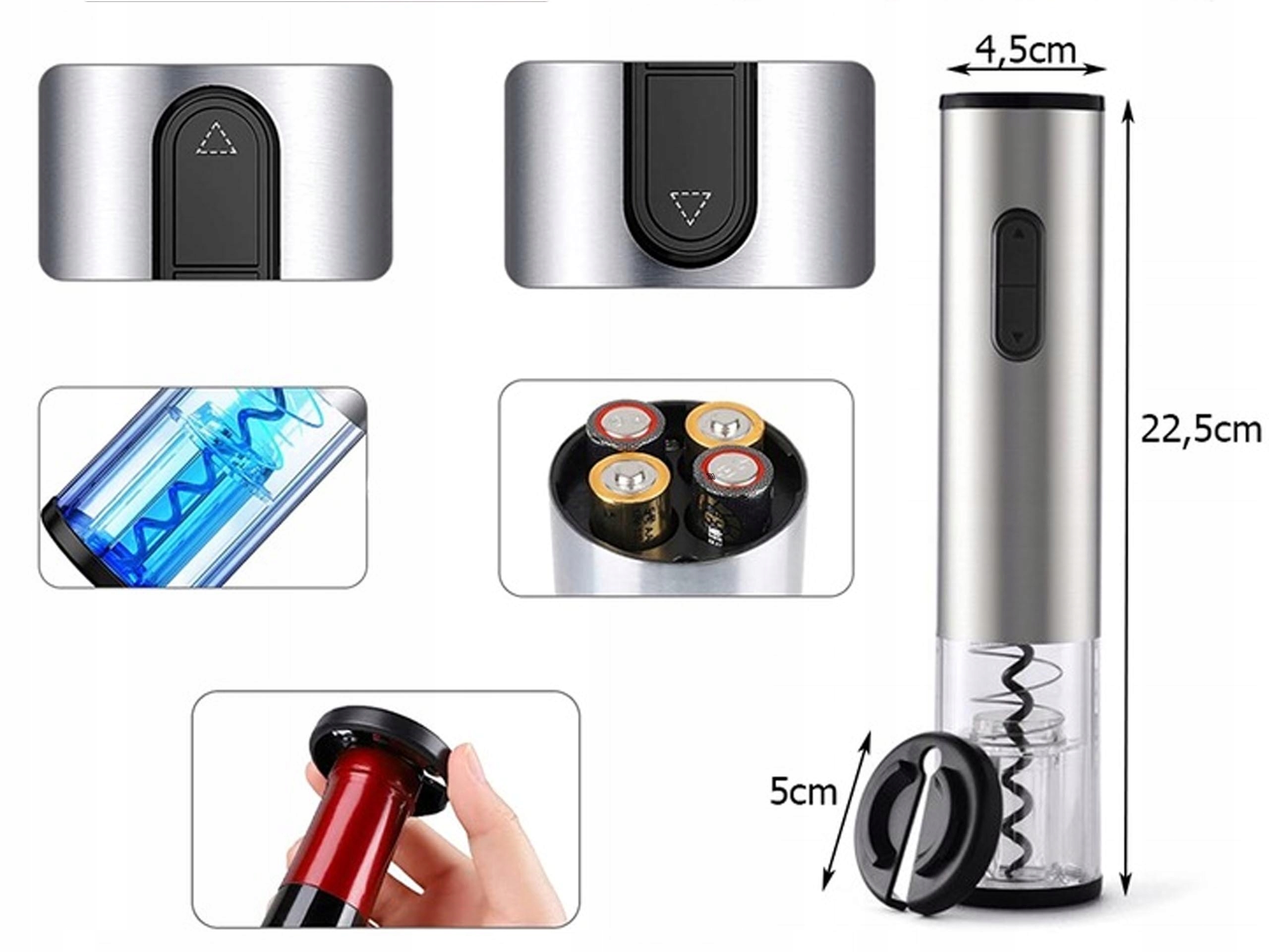 Штопор питается от 4 батареек АА. Изготовлен из высококачественных материалов, имеет стильный и элегантный дизайн. Очень красиво и элегантно смотрится на кухонном столе или столешнице.