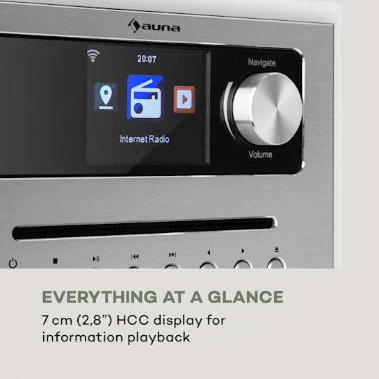 Устройство имеет элегантный внешний вид: на алюминиевой передней панели расположены WLAN-радио и FM-тюнер. Предложение радиостанций огромно: Возможность принимать до 10 000 интернет-радиостанций со всего мира. Такая информация, как время, песня и исполнитель, четко отображается на дисплее HCC. Управление башней Silver Star CD Cube осуществляется с помощью панели управления на устройстве или с удобного дивана с помощью пульта дистанционного управления.