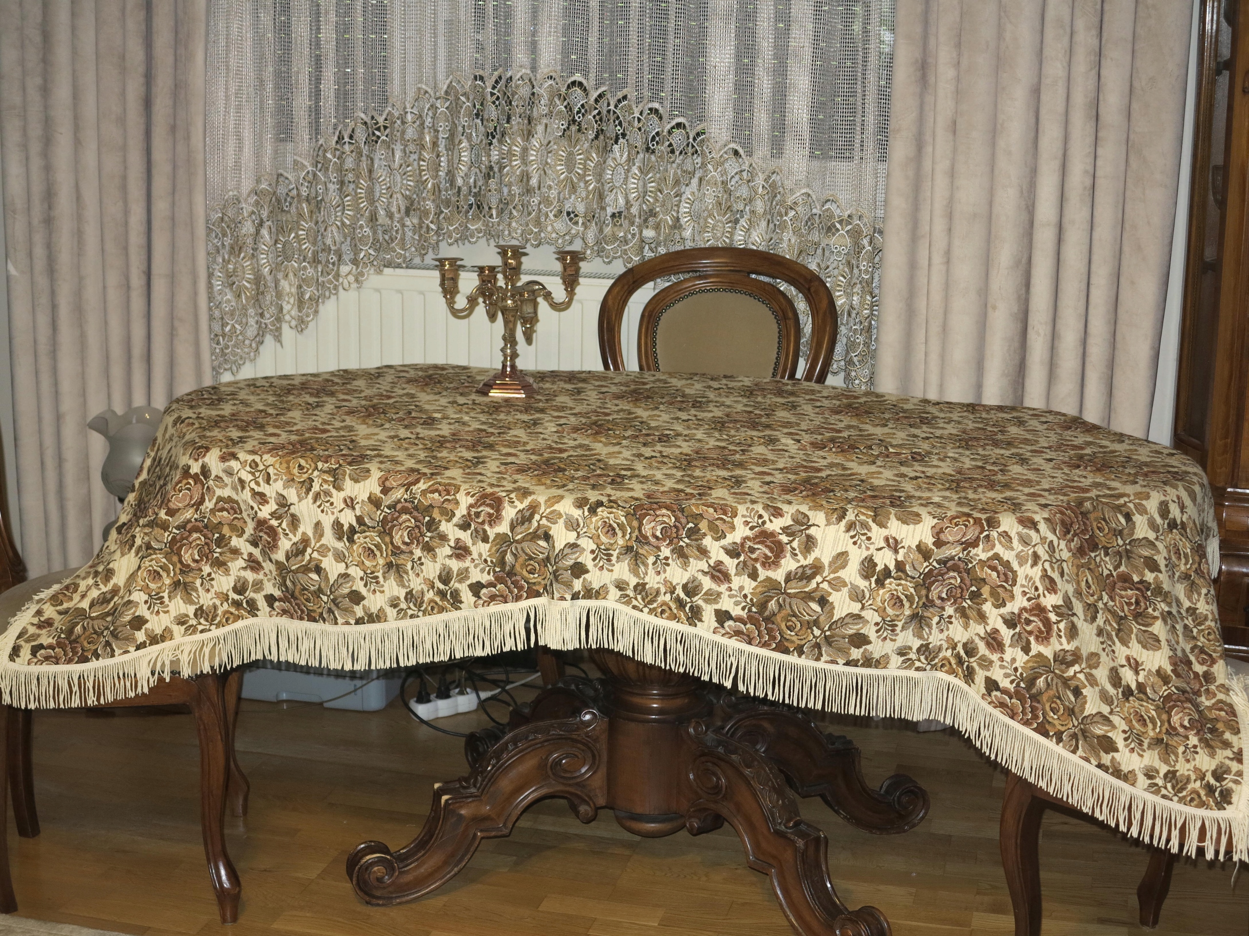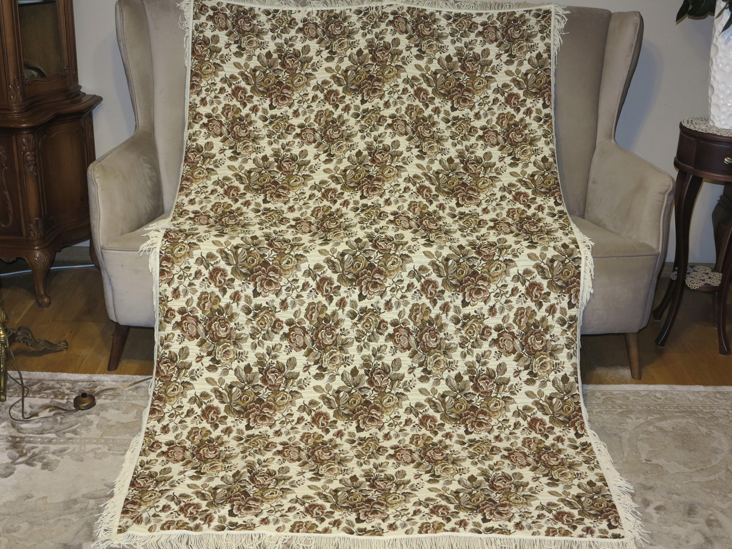 Объект аукциона - чрезвычайно красивая крупная скатерть гобелен, куст с букетами из розы. Стенка имеет размеры: 210/129 см плюс 6 см. Использовал скатерть, в супер хорошем состоянии и качество, несмотря на ваш возраст. Я рекомендую, отличное украшение стильного интерьера.
