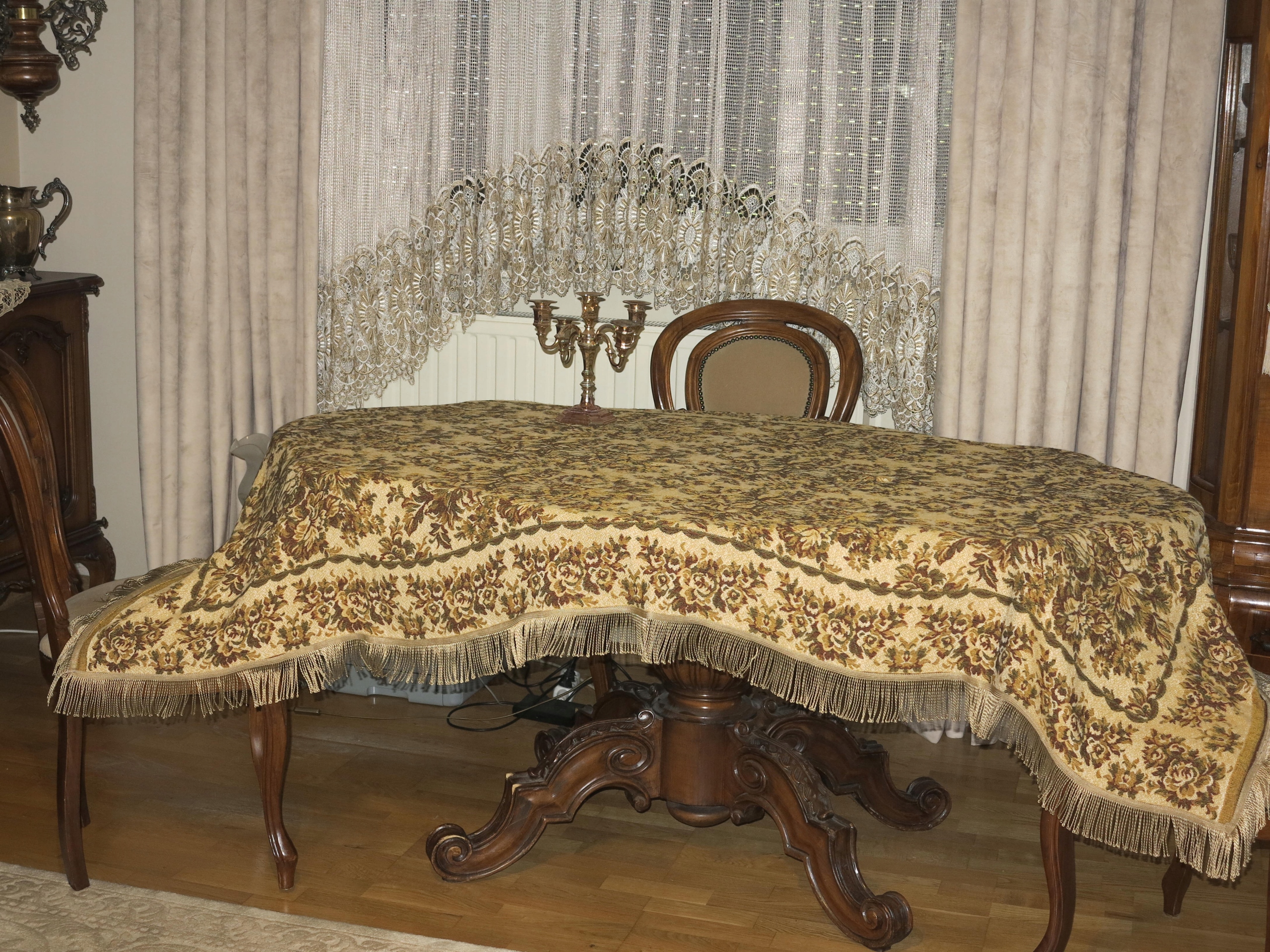 Размеры: 228/128см+7 см. Использовал скатерть, в супер хорошем состоянии и качество, несмотря на ваш возраст. Я рекомендую, отличное украшение стильного интерьера.