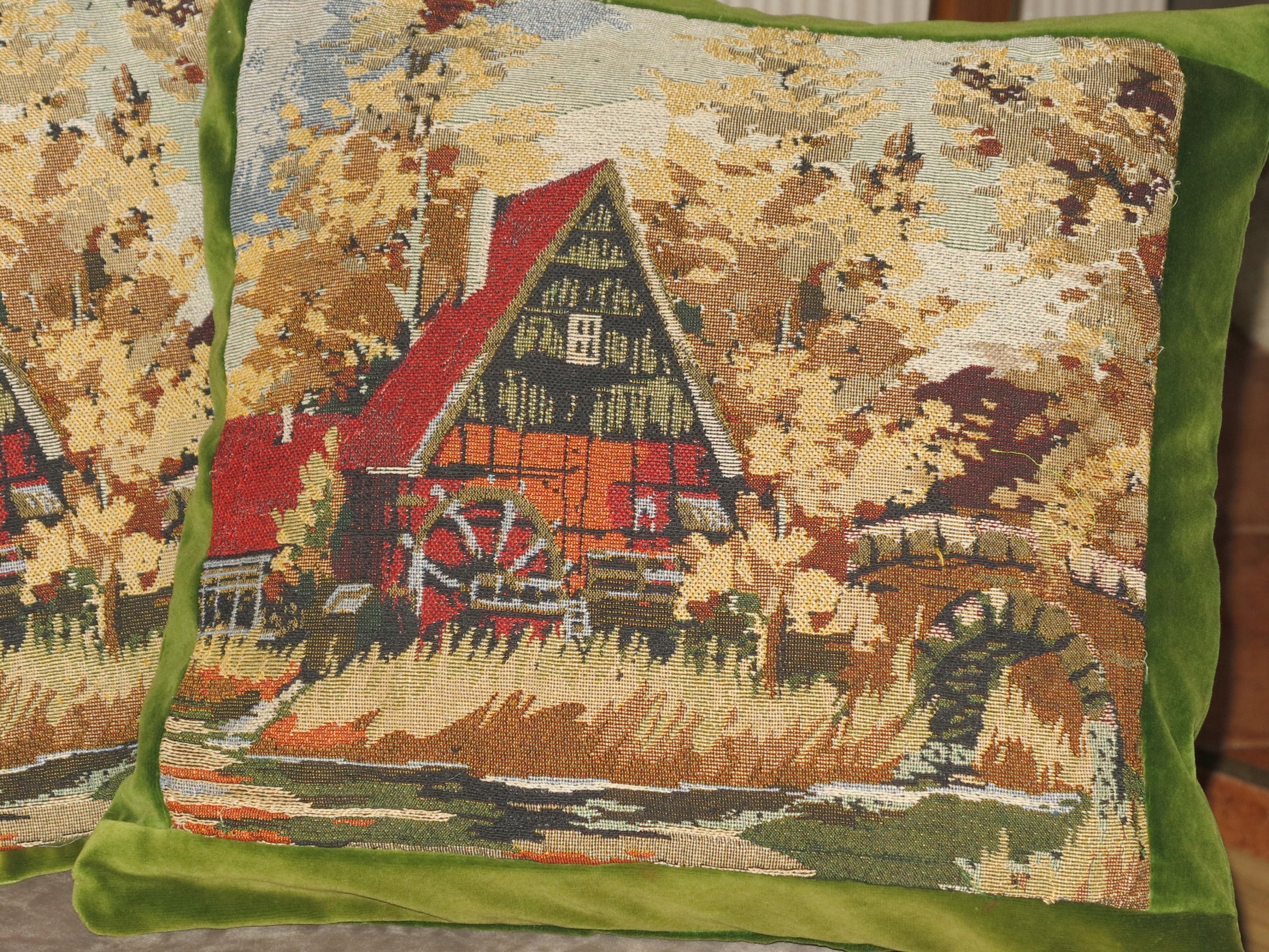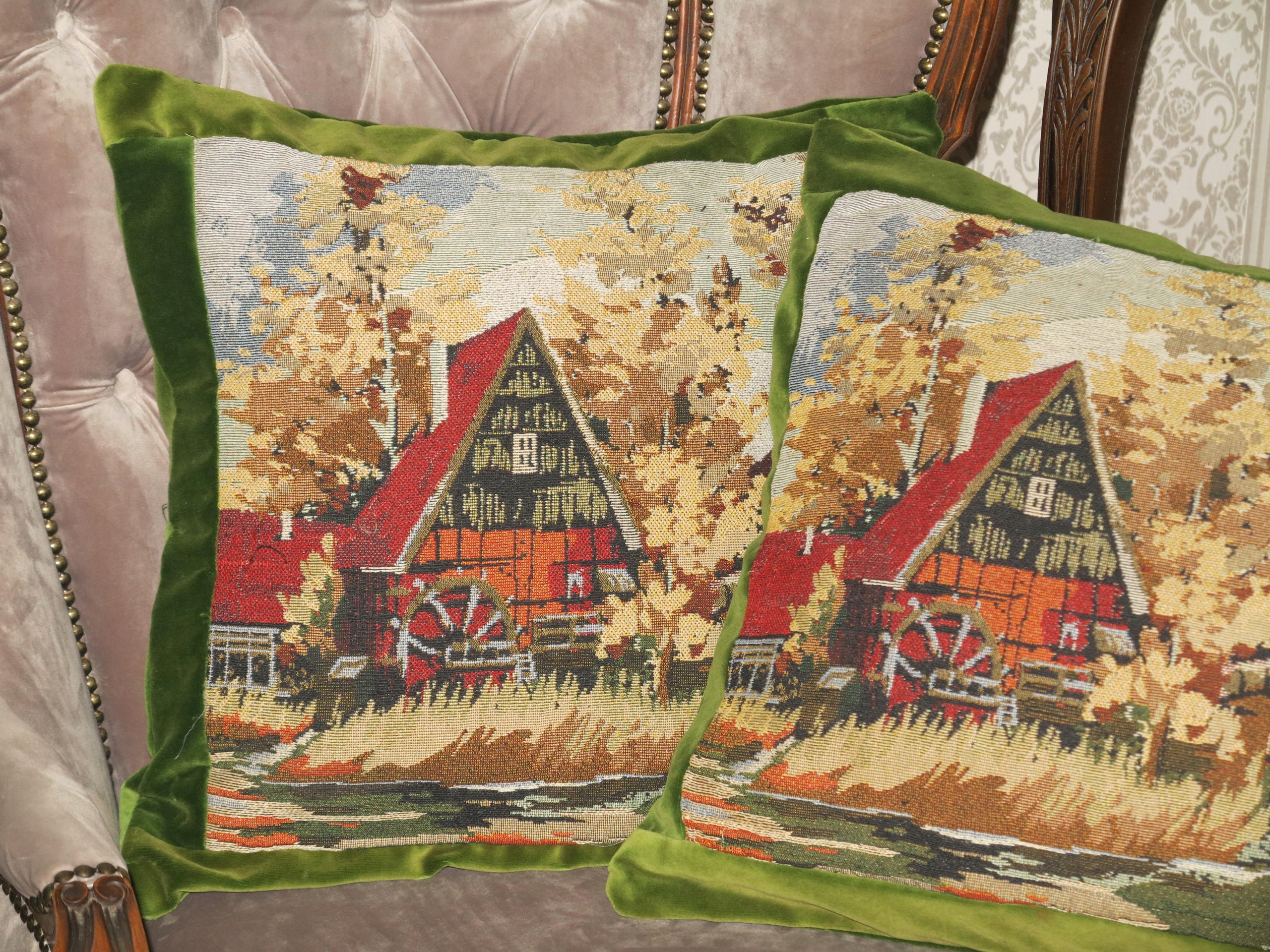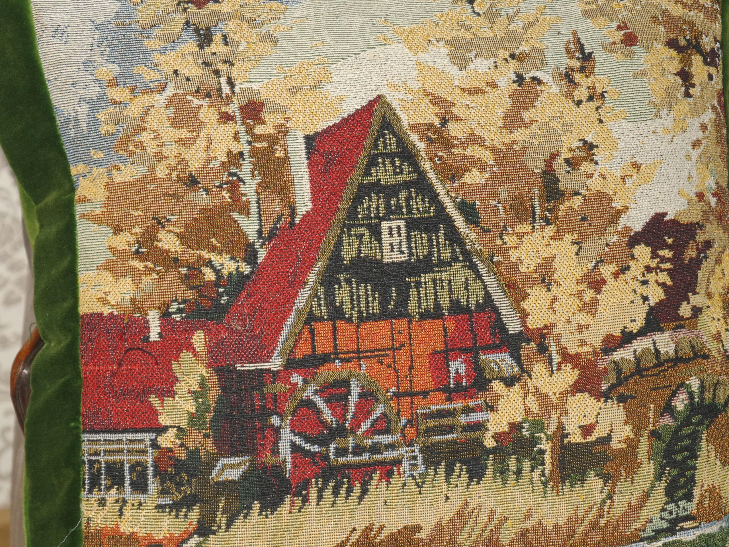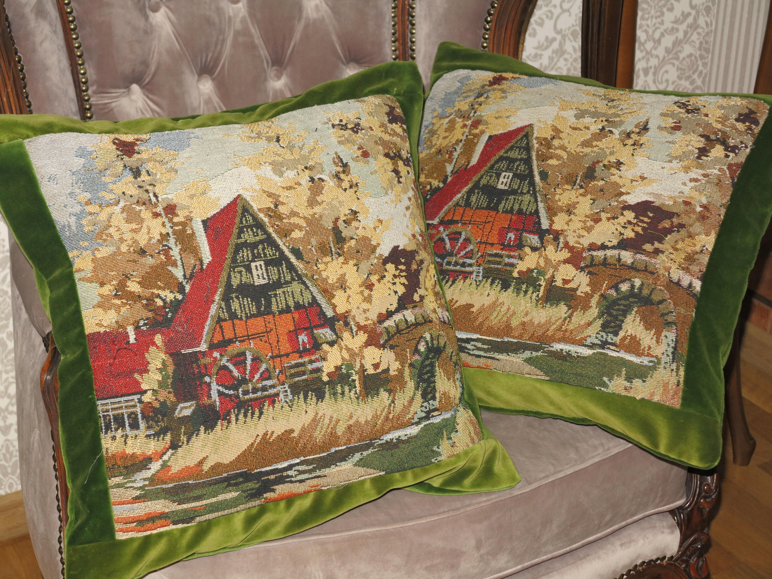 для антиквариата- набор чрезвычайно красивых Стильные, твердые бархатные подушки с гобеленом- старая мельница над потоком