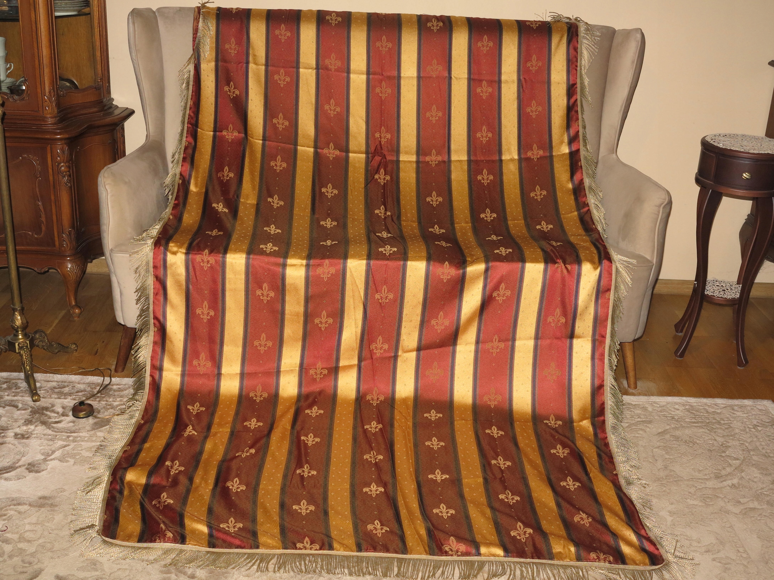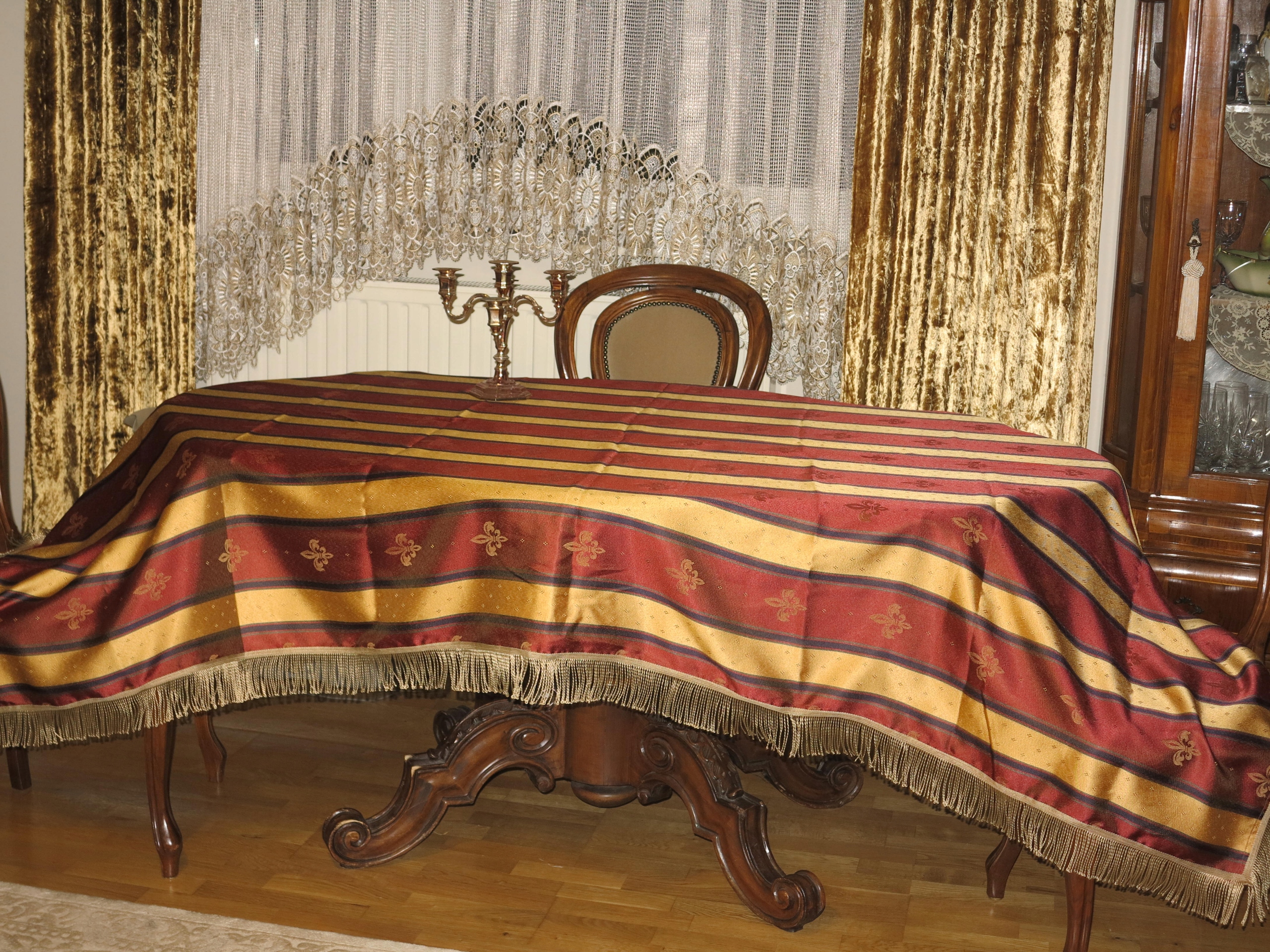 для знатока-очень красивая огромная стильная скатерть, сделанная из жаккардовой ткани в ремнях Людвиковски, в борде и золоте. Украшен стильным рисунком. О золотых окраинах. Для красивых полос. Размеры тролбала: 234/138 см+7 см. Используйте скатерть, но в супер хорошем состоянии и качество, я искренне рекомендую