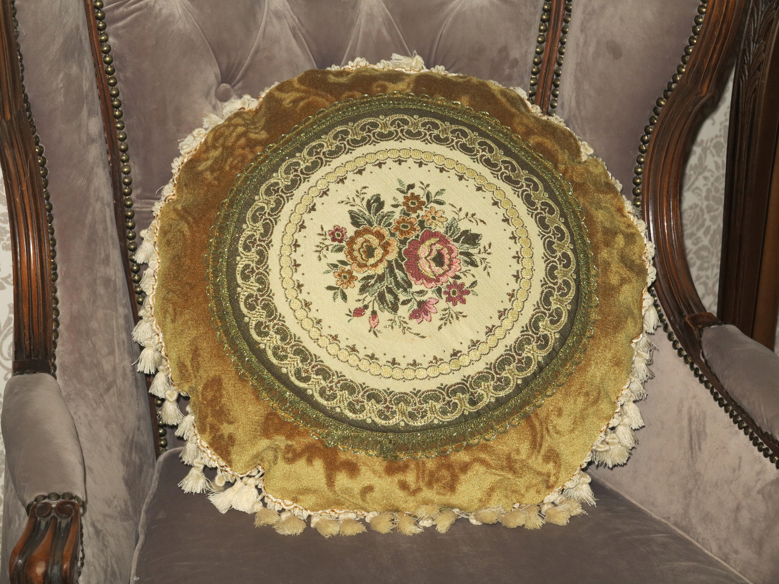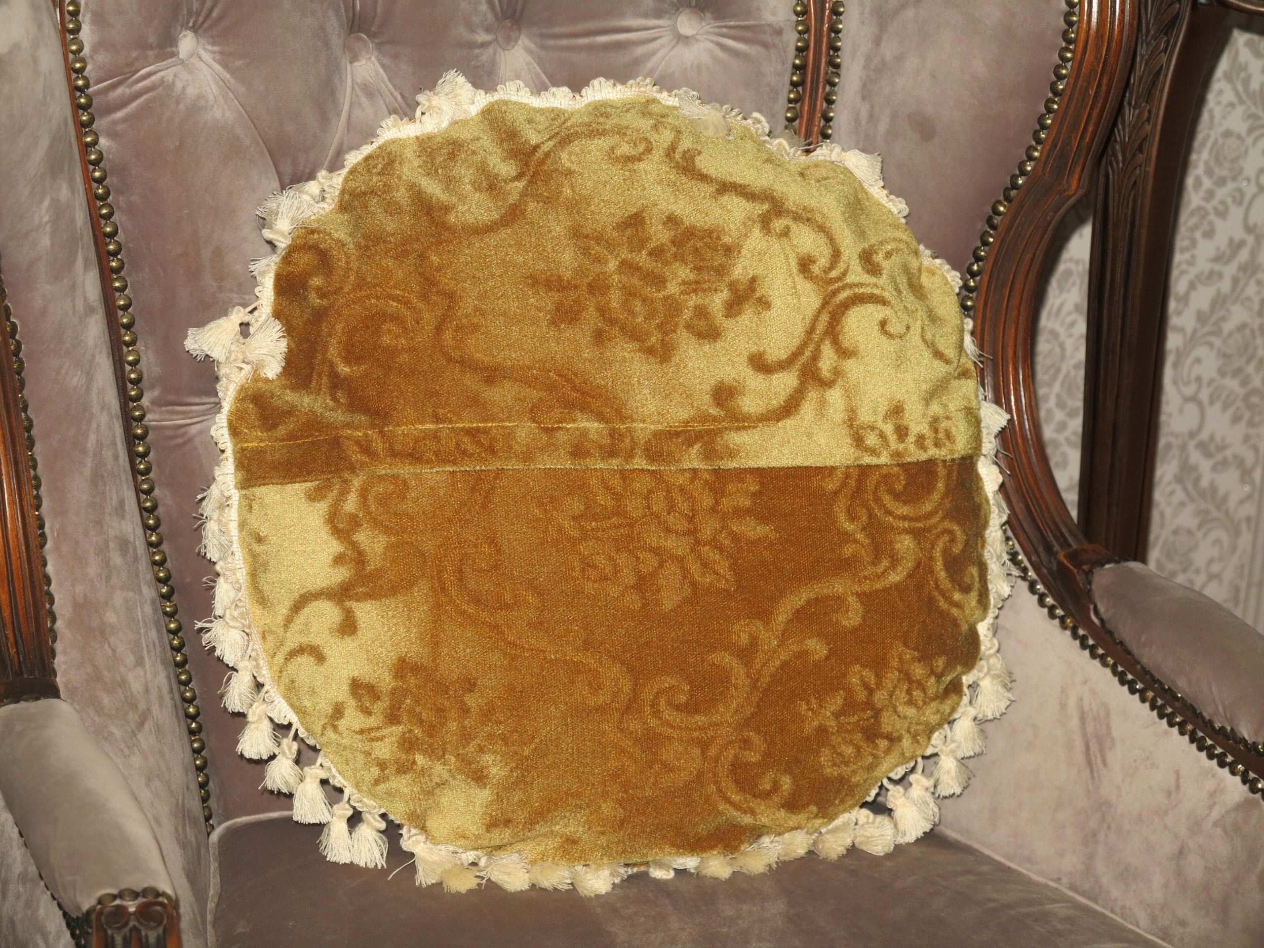 для знатока- исключительная красота, большую стильную древнюю круглую подушку с начинкой. Подушка высочайшего качества густого золотого бархата с тисненом рисунком. Для приблизительно украшенной габардашерии с пикотами