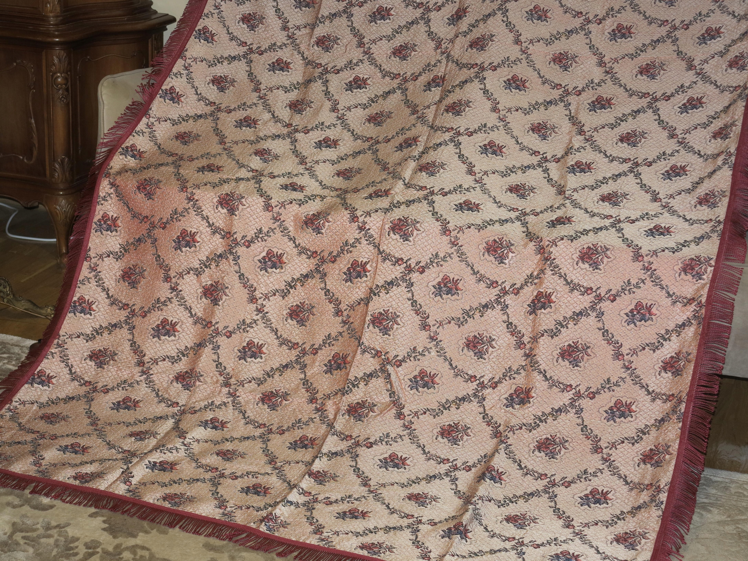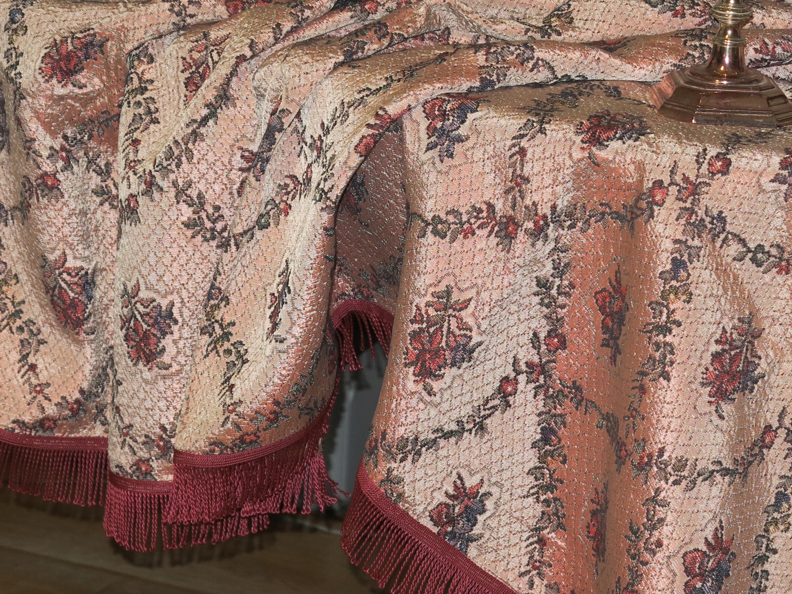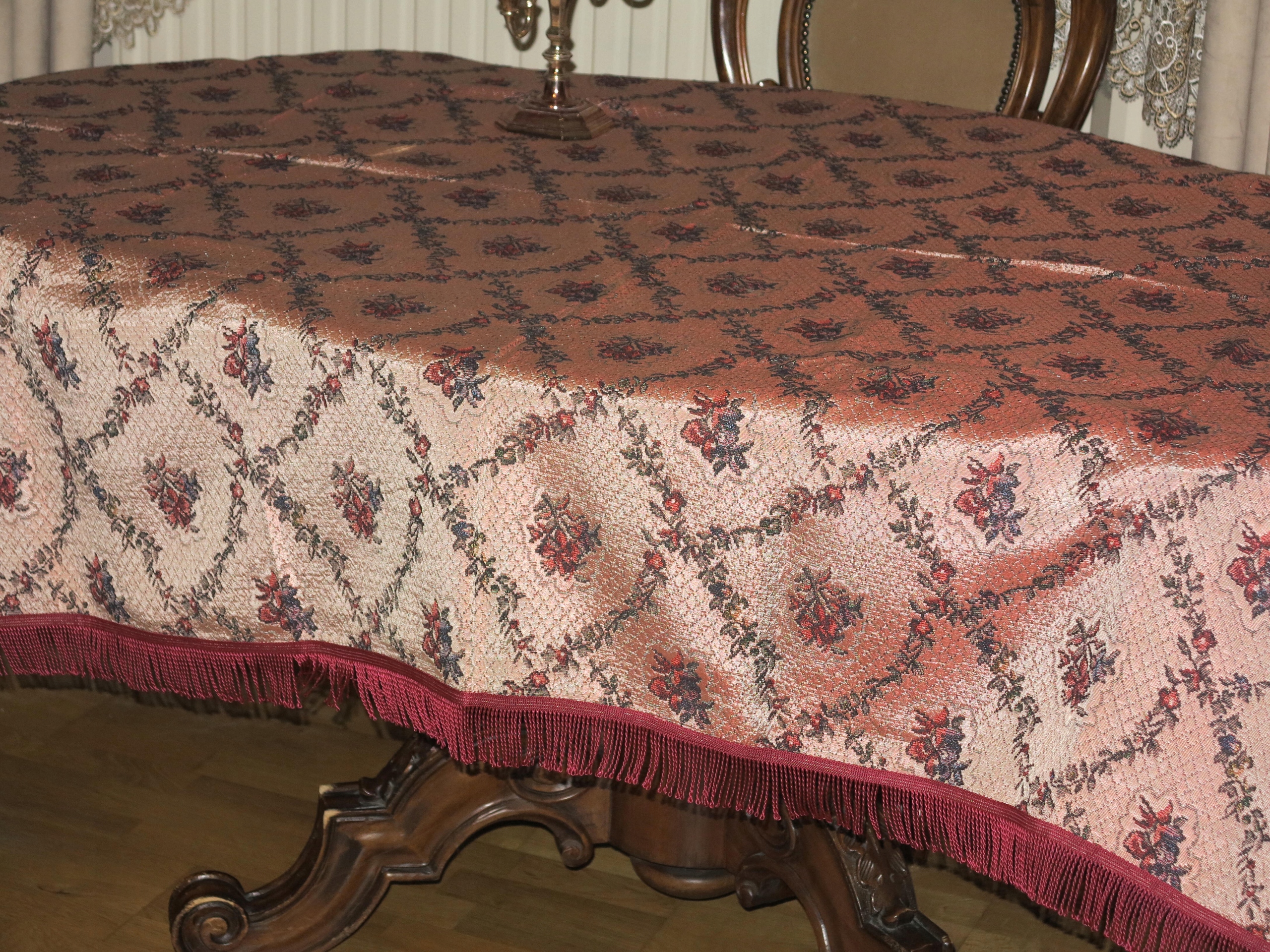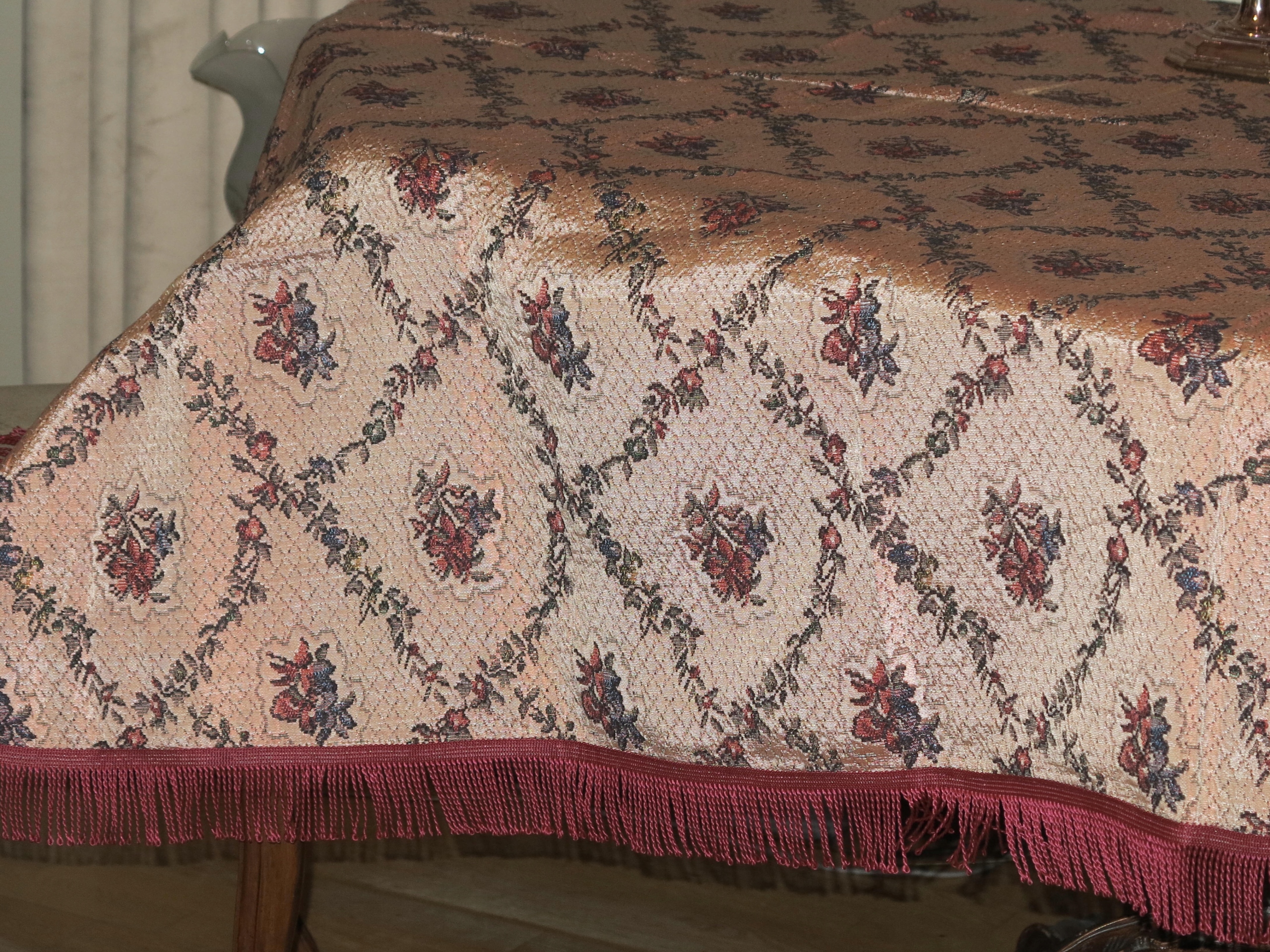 для антиквариата-красивая большая скатерть гобелена со стильными узорами. Гобелен имеет добавление шелковой нити, которая делает цвет красиво мерцающим. Примерно украшен полосами.