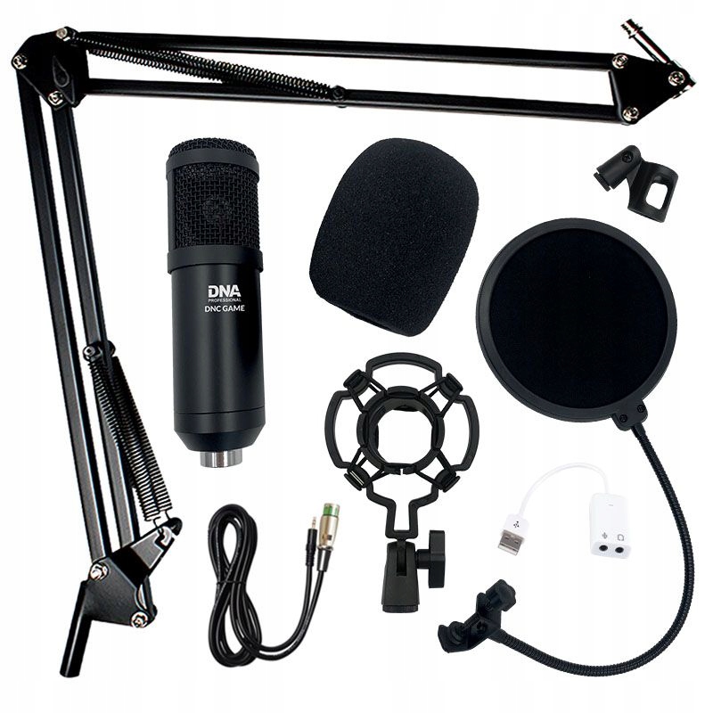 DNC Game-это набор настольных микрофонов, который состоит из емкостного микрофона с анти-шоком, рычаг стрелы, прикрученной к столешнице, анти-tap-фильтру, наложенного на микрофон и поп-фильтр на «Гужую шею», подавляющий формирование так называемых взрывов и кабеля xlr-jack