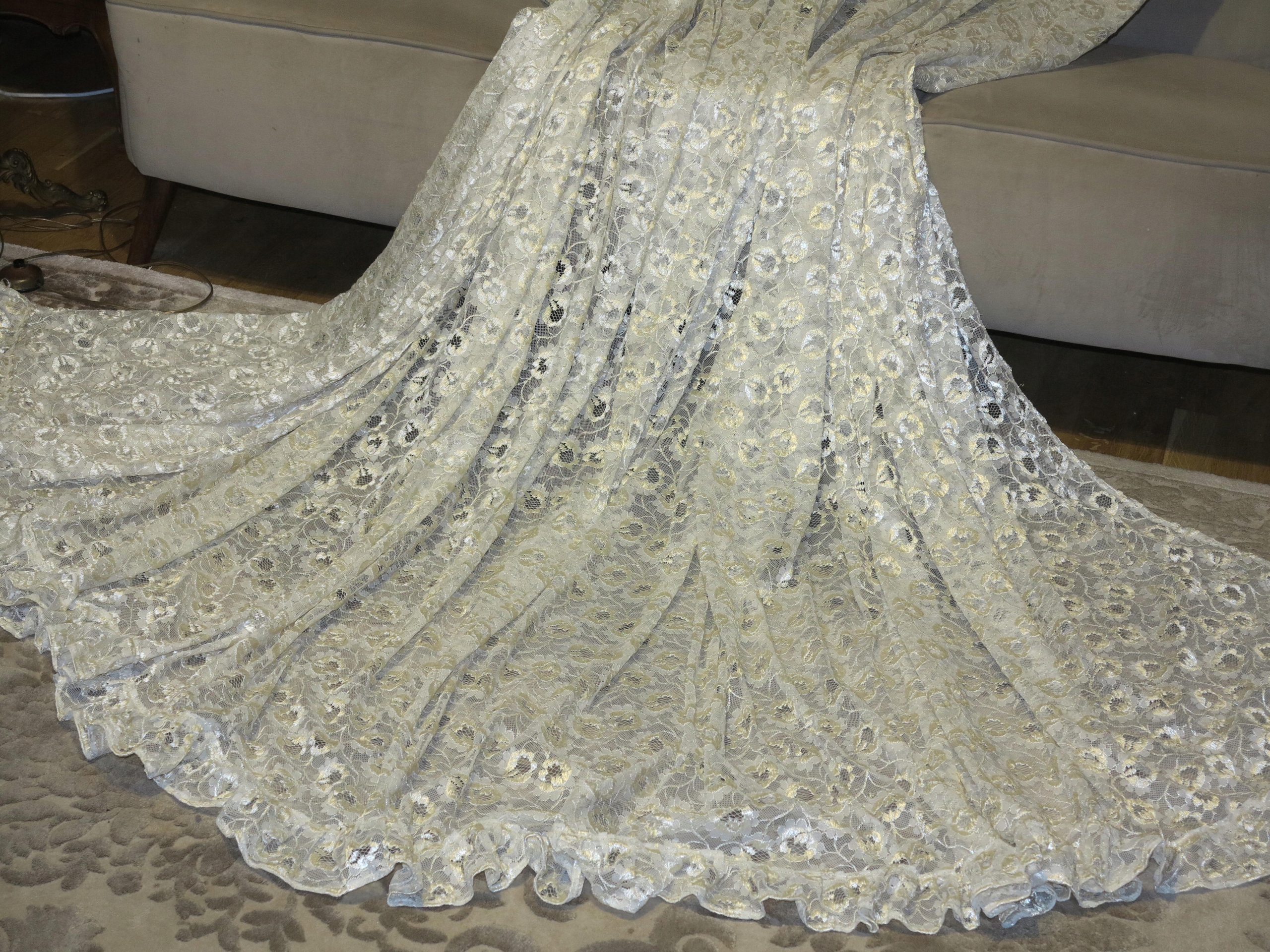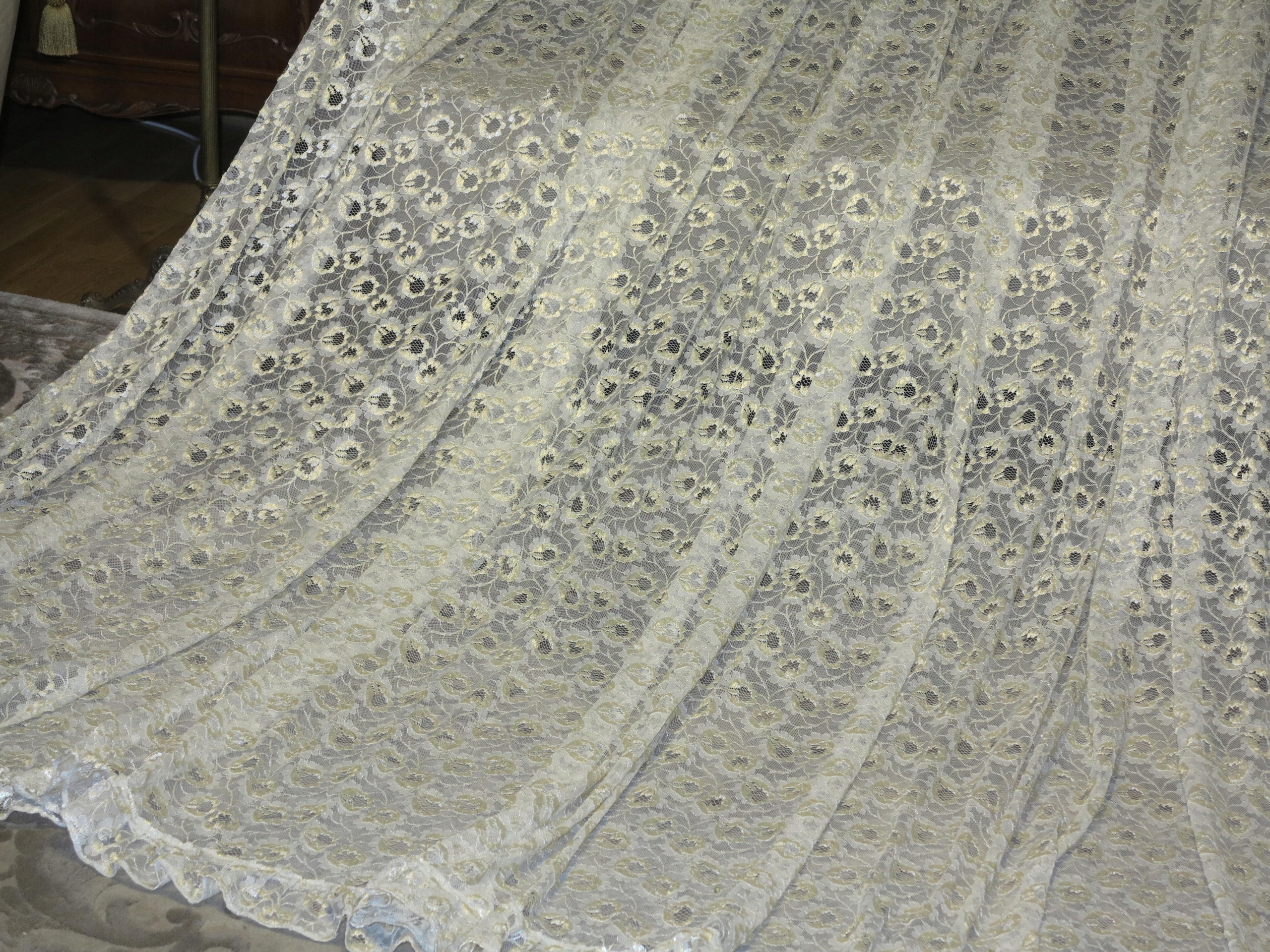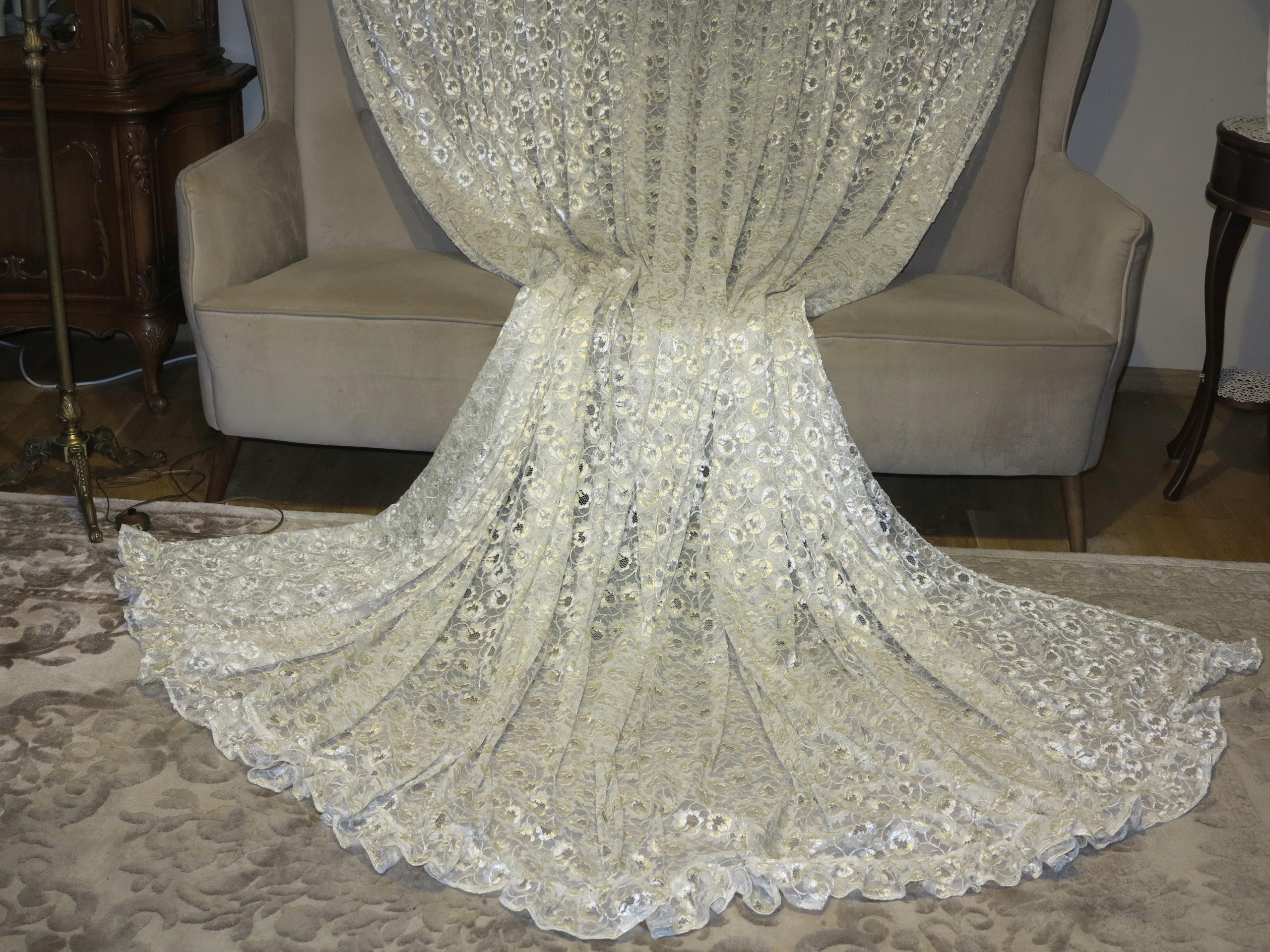 для усадьбы- чрезвычайно очаровательный, романтический занавес с высочайшим более толстым, но мягким кружевом, дно с узким обчистком. Занавес имеет жемчужные бежевые узоры. /p>