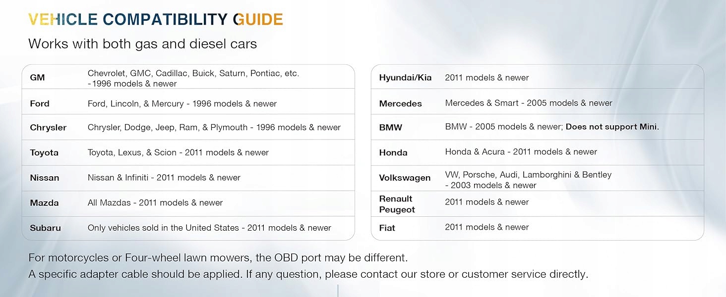 совместим с большинством автомобилей, производимых после 1996 года в США и после 2000 года в Европе и Азии . Он работает как с бензиновыми, так и с дизельными двигателями. p>