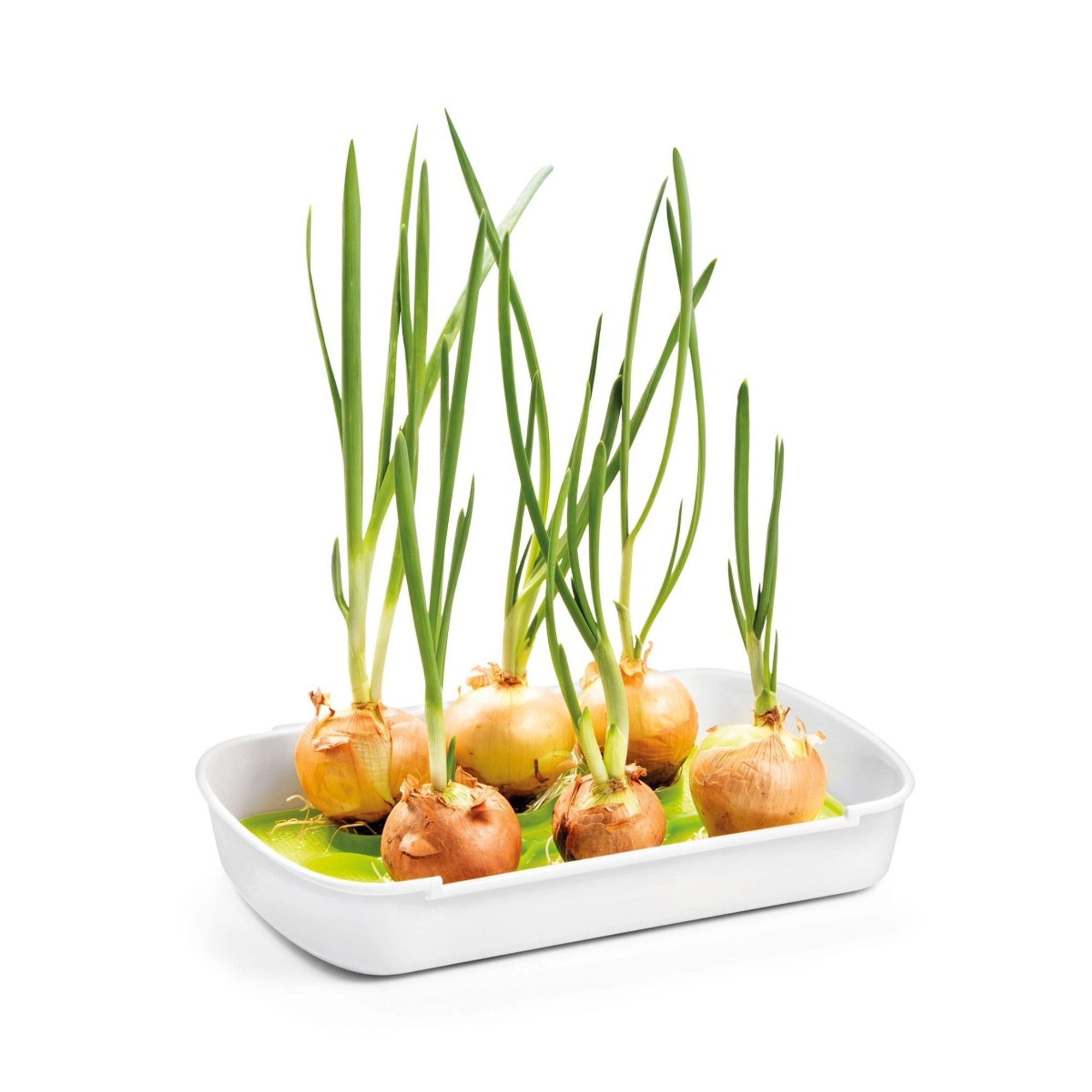 позволяет успешно практиковать микрогрин в домашних условиях. Микрогрины - это молодые растения, предназначенные для сбора урожая вскоре после прорастания, идеально подходят для мелких украшений блюд и для ароматизирующих салатов и т. Д. лопаточка многофункционально. Это также позволяет выращивать зеленые побеги от всего лука, чеснока или отходы корневых овощей, растущих на противоположной стороне сетки.