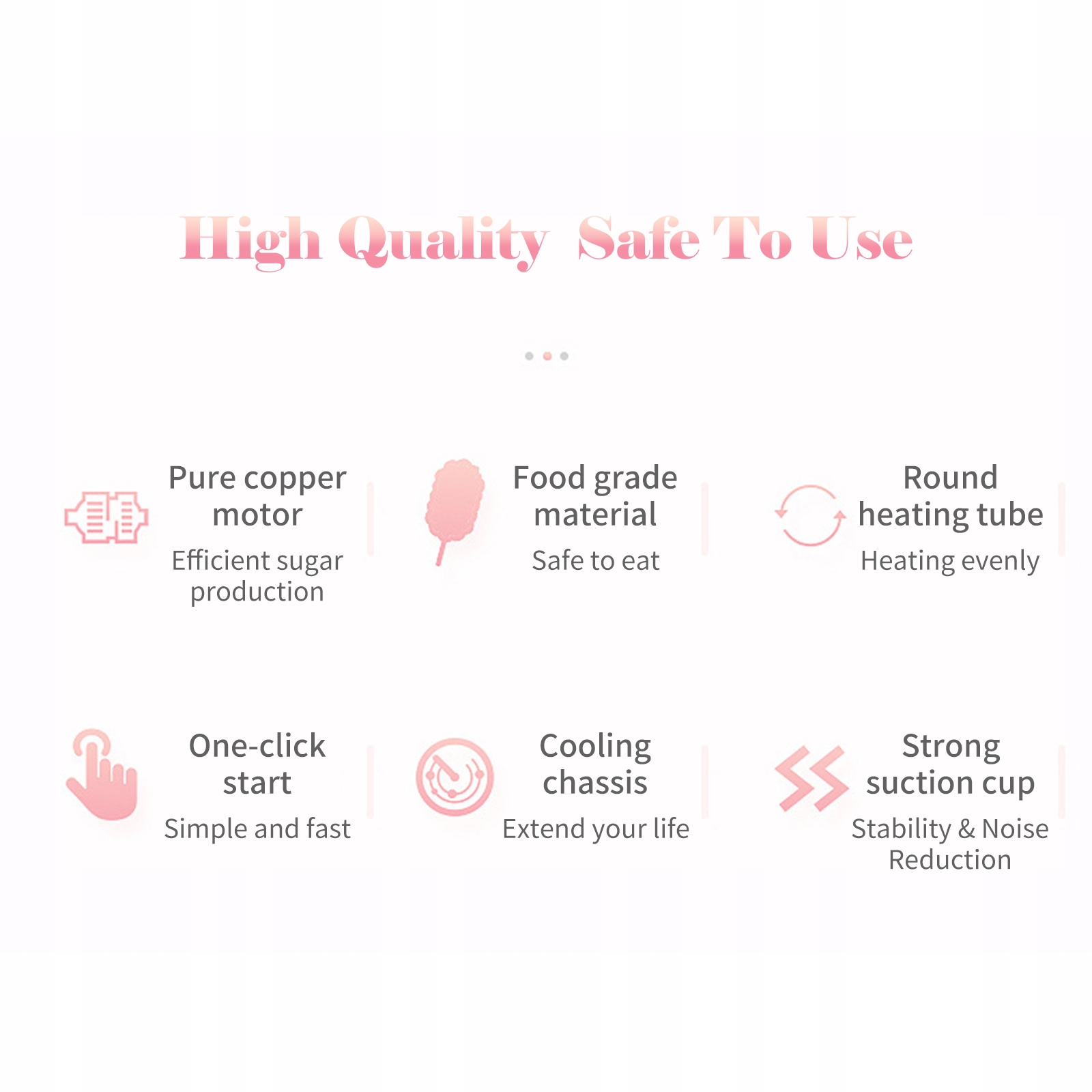 3. 【Запуск одной кнопки】: Эта вата сахая принимает дизайн одной кнопки, которую проще в использовании. Просто включите переключатель, нагревайте в течение 2 минут, затем выключите выключатель (допустимый), добавьте сахарные или скальные конфеты в разных цветах