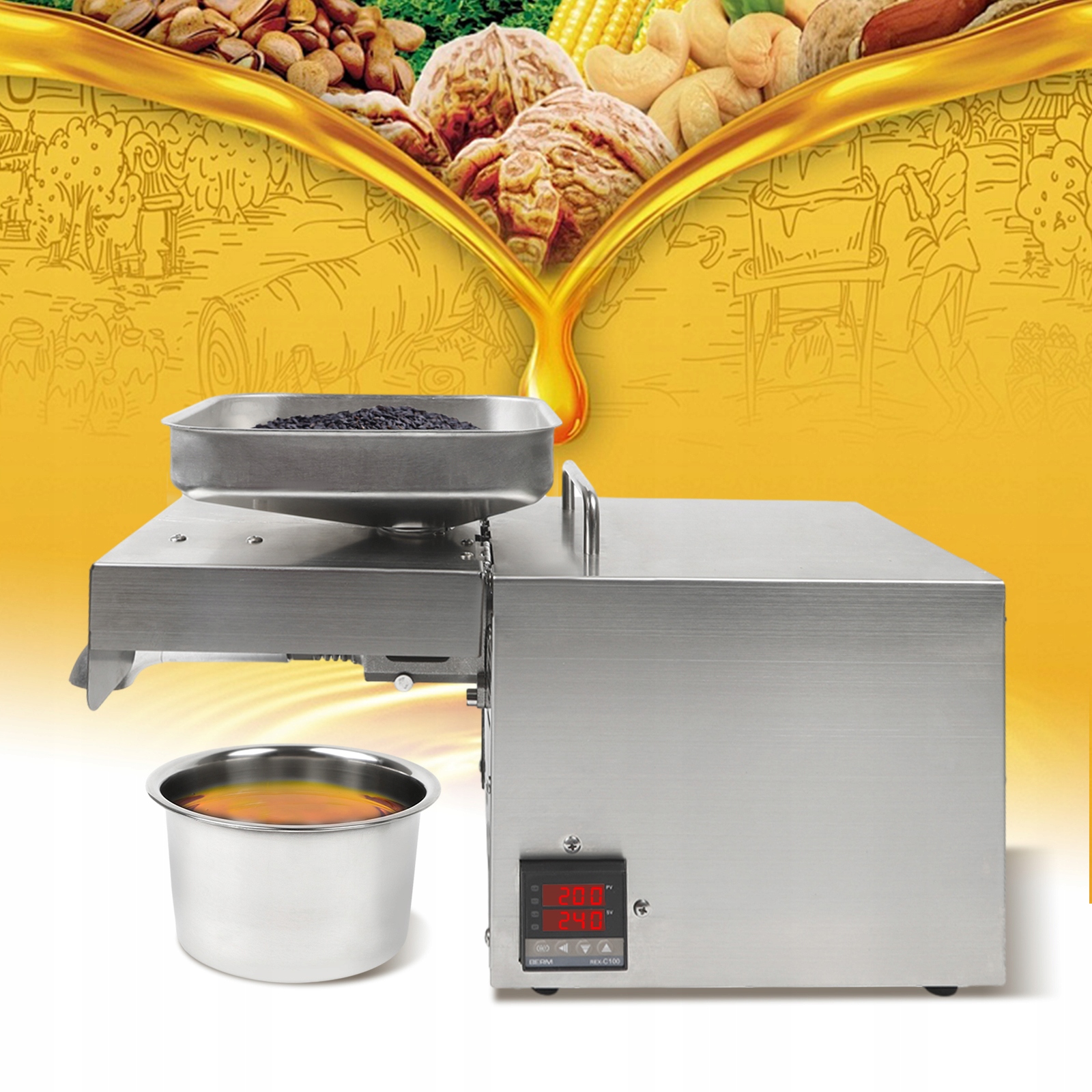 Регулируемая температура : продукт оснащен интеллектуальным цифровым регулятором температуры, который позволяет контролировать температуру в диапазоне от 40 до 240 ° C (104-240 ° C) и контролировать его в режиме реального времени, что позволяет точно контролировать скорость нажатия масла.