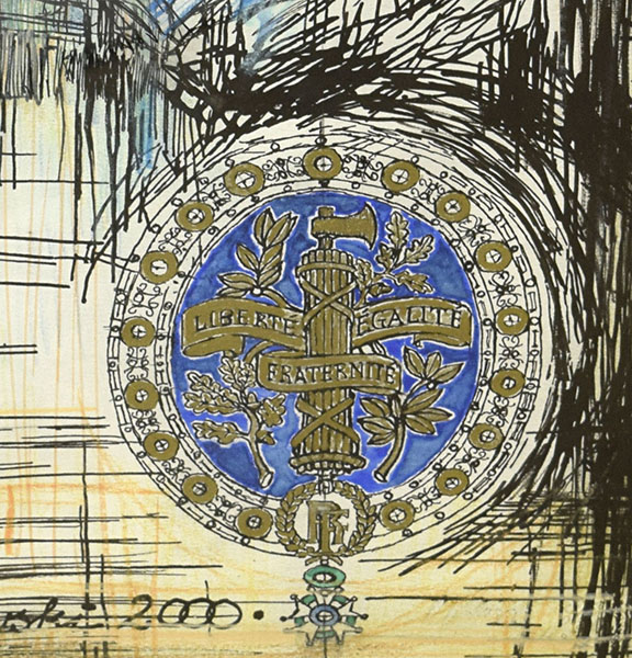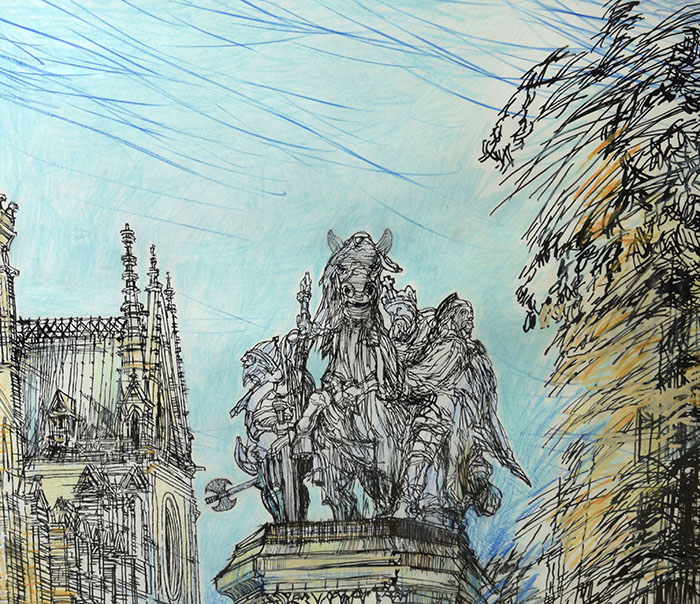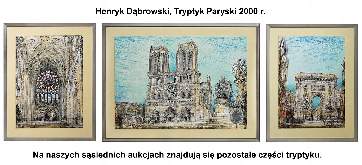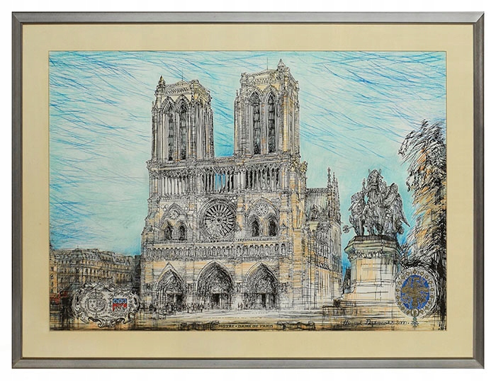 Работа выполнена тушью и мелом на бумаге, в рамке. паспарту и рама за стеклом, изображающая рисунок и цветной этюд «Париж – Собор Парижской Богоматери». Рисунок подписан и датирован «Генрик Домбровский 2000» и надписью «НОТР-ДАМ ДЕ ПАРИЖ». Размеры рисунка в паспарту 68 х 98 см.