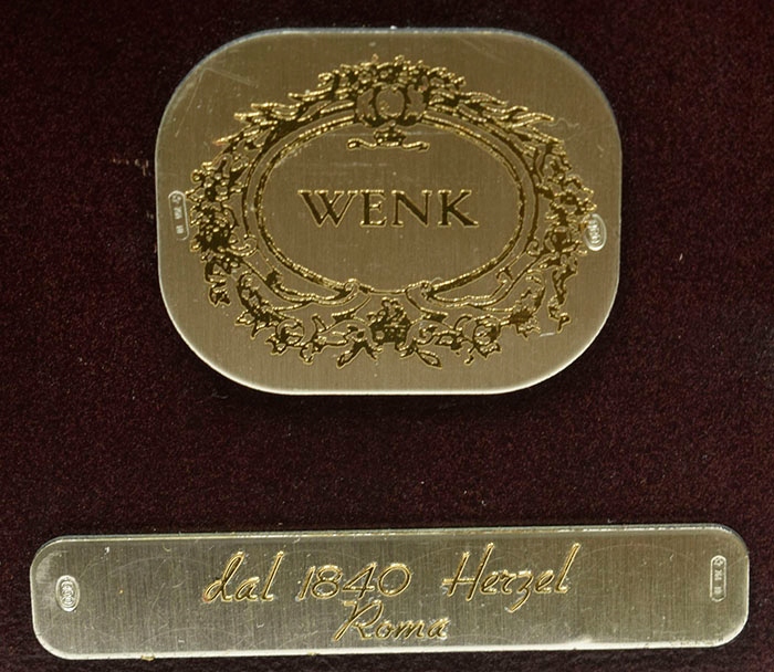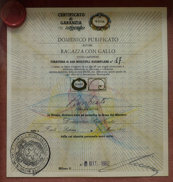 Красивая старинная картина, гравюра на серебряной тарелке, изображающая девушку с петухом. Картина подписана «Purificato». На оборотной стороне сертификат в рамке за стеклом.