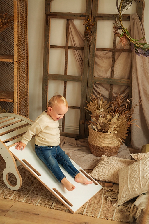 Качалка Монтессори может служить элементом полосы препятствий, местом отдыха или пространством для активного времяпрепровождения, особенно в хмурые месяцы.