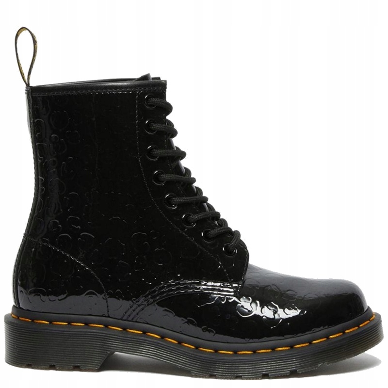 Классические ботинки из коллекции обуви Dr. Док Мартенс. Шнуровка с восемью отверстиями. Изготовлен из натуральной лаковой кожи черного цвета. Украшен леопардовыми пятнами, тисненными на коже. Подошва пришита к верху обуви знаменитой желтой нитью (технология Goodyear Welted). Подошва имеет так называемую характеристику обуви Dr.Martens. подушка безопасности.