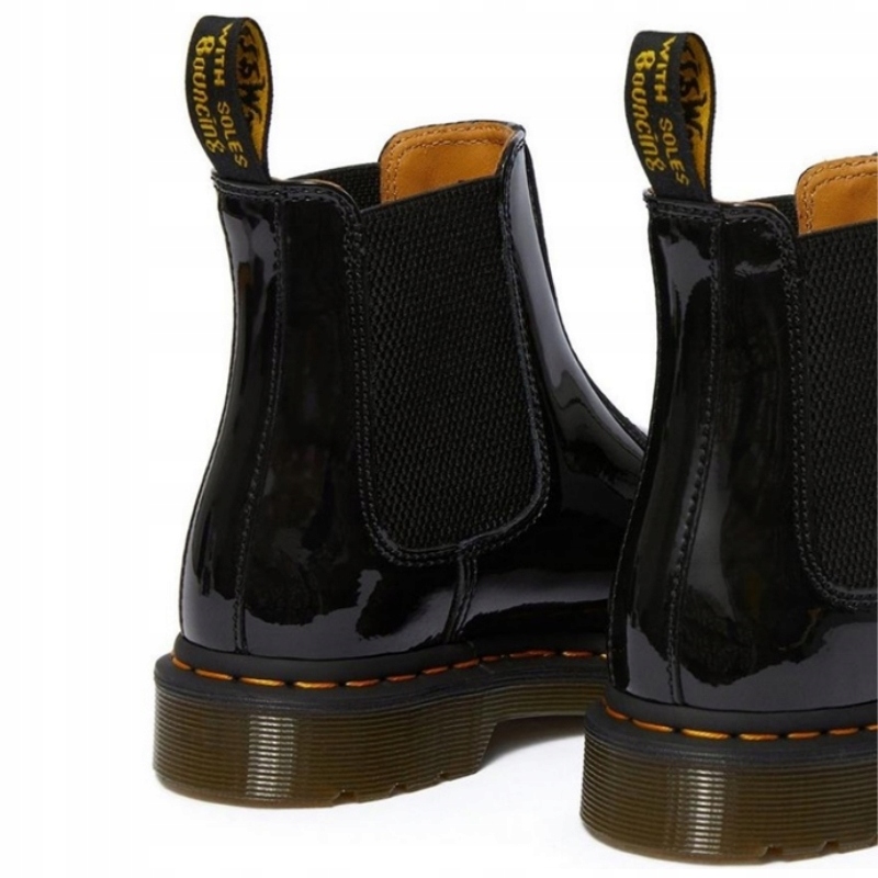 Оригинальные ботинки челси из коллекции Dr. Док Мартенс. Изготовлен из лакированной кожи черного цвета. Надевается. Две широкие эластичные ленты, вшитые по бокам верха, облегчают надевание. Подошва пришита к верху обуви знаменитой желтой нитью (технология Goodyear Welted). Подошва имеет так называемую характеристику обуви Dr.Martens. воздушная подушка, повышающая комфорт ходьбы.