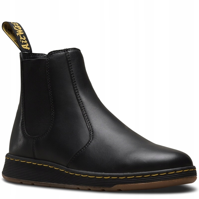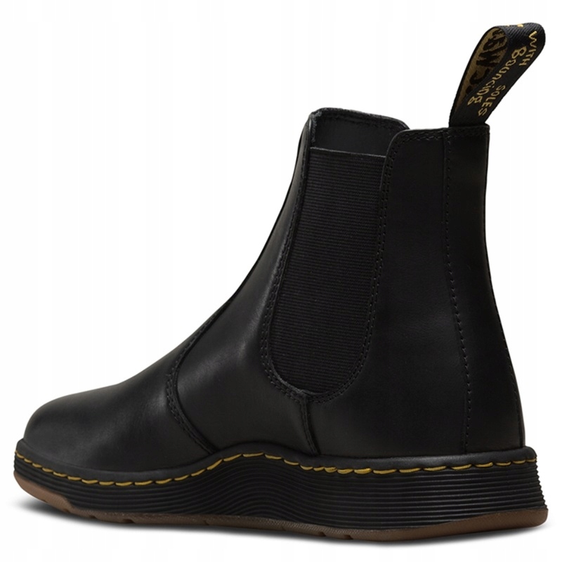 Оригинальные ботинки челси из коллекции Dr. Док Мартенс. Надевать. Изготовлен из натуральной лицевой кожи черного цвета. Технология SoftWair - внутренняя система вкладышей, запатентованная Dr. Martens, повышающие комфорт при ходьбе за счет вентиляции внутренней части обуви и поглощения ударов. Гибкая, легкая подошва характерной формы, пришитая к верху обуви типичной для Martens желтой нитью.