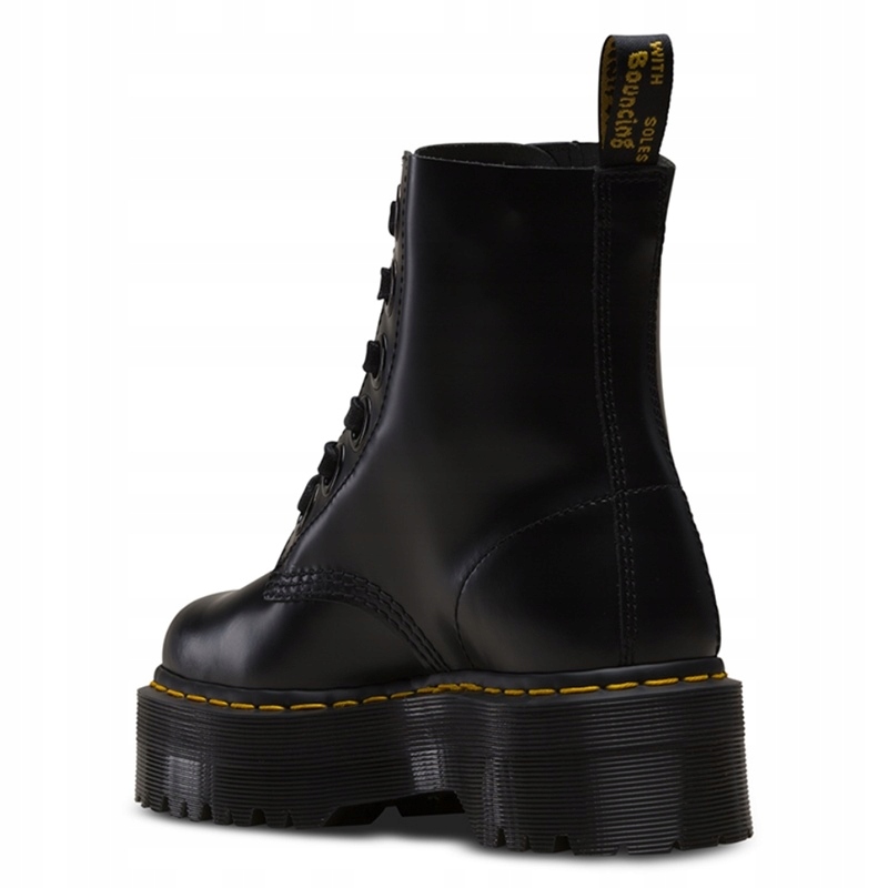 Оригинальные ботинки из коллекции обуви Dr. Док Мартенс. Строка #QUAD. Зашнуровано шестью большими декоративными люверсами. Изготовлен из гладкой натуральной кожи черного цвета. Вощеные шнурки (шнурки из атласной ленты в комплекте). Характерная подошва, пришитая к верху обуви знаменитой желтой нитью (технология Goodyear Welted). Подошва имеет так называемую типичную подошву Мартенса. воздушная подушка. Высота подошвы: спереди - 3,50 см, сзади - 4,50 см.