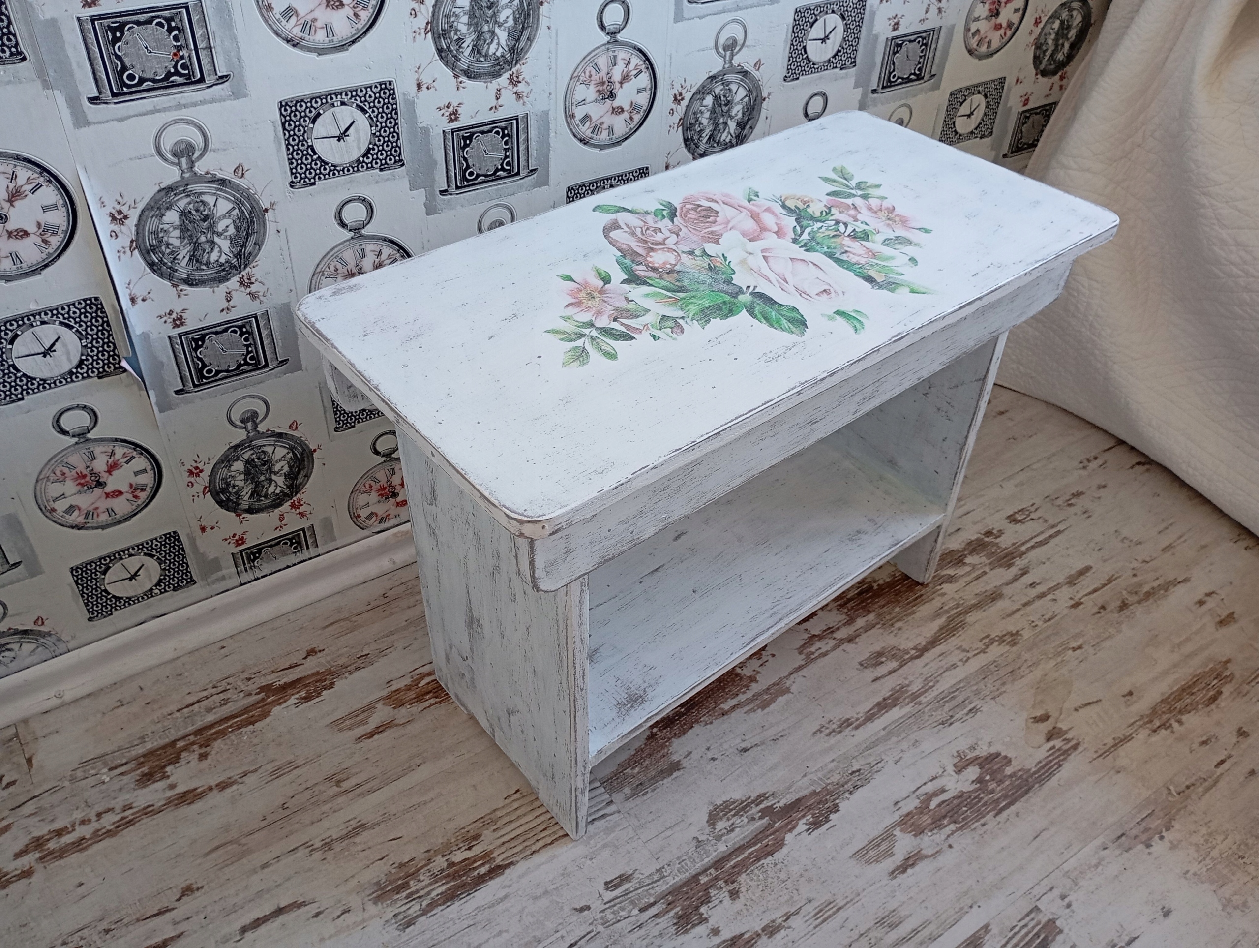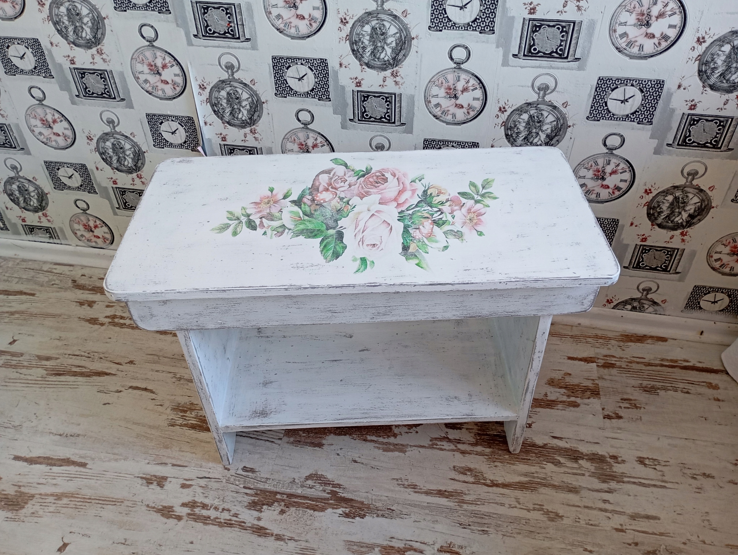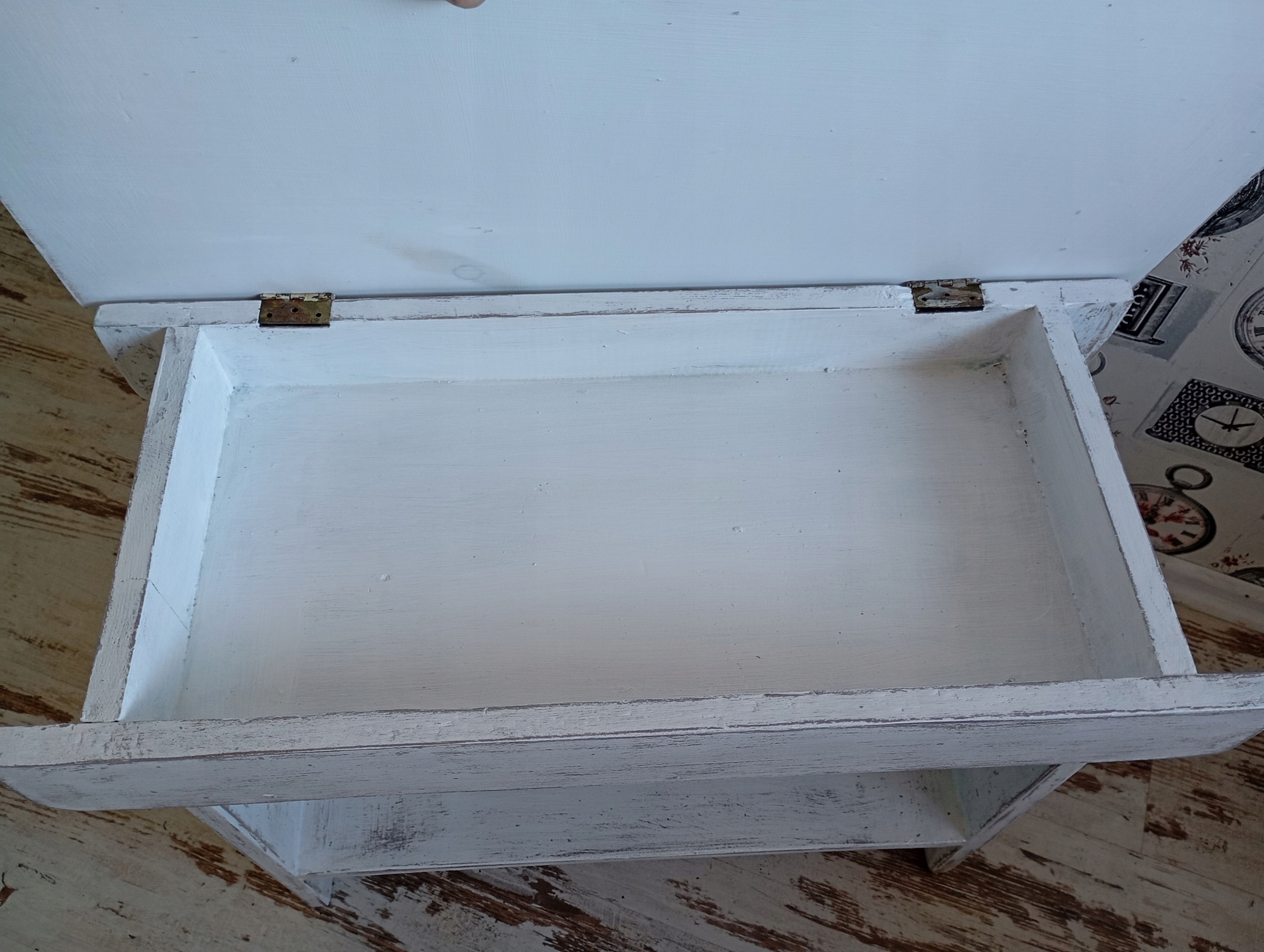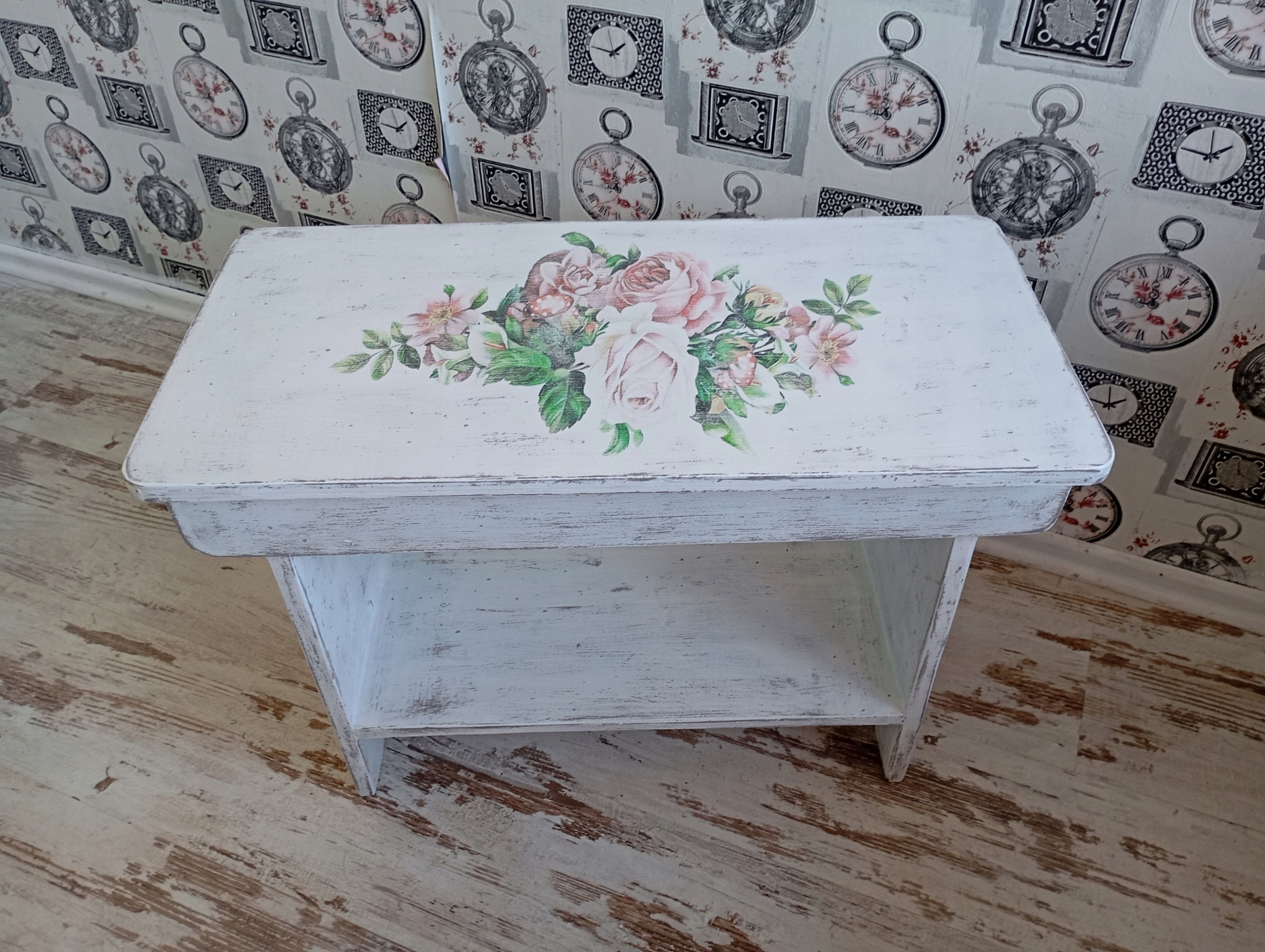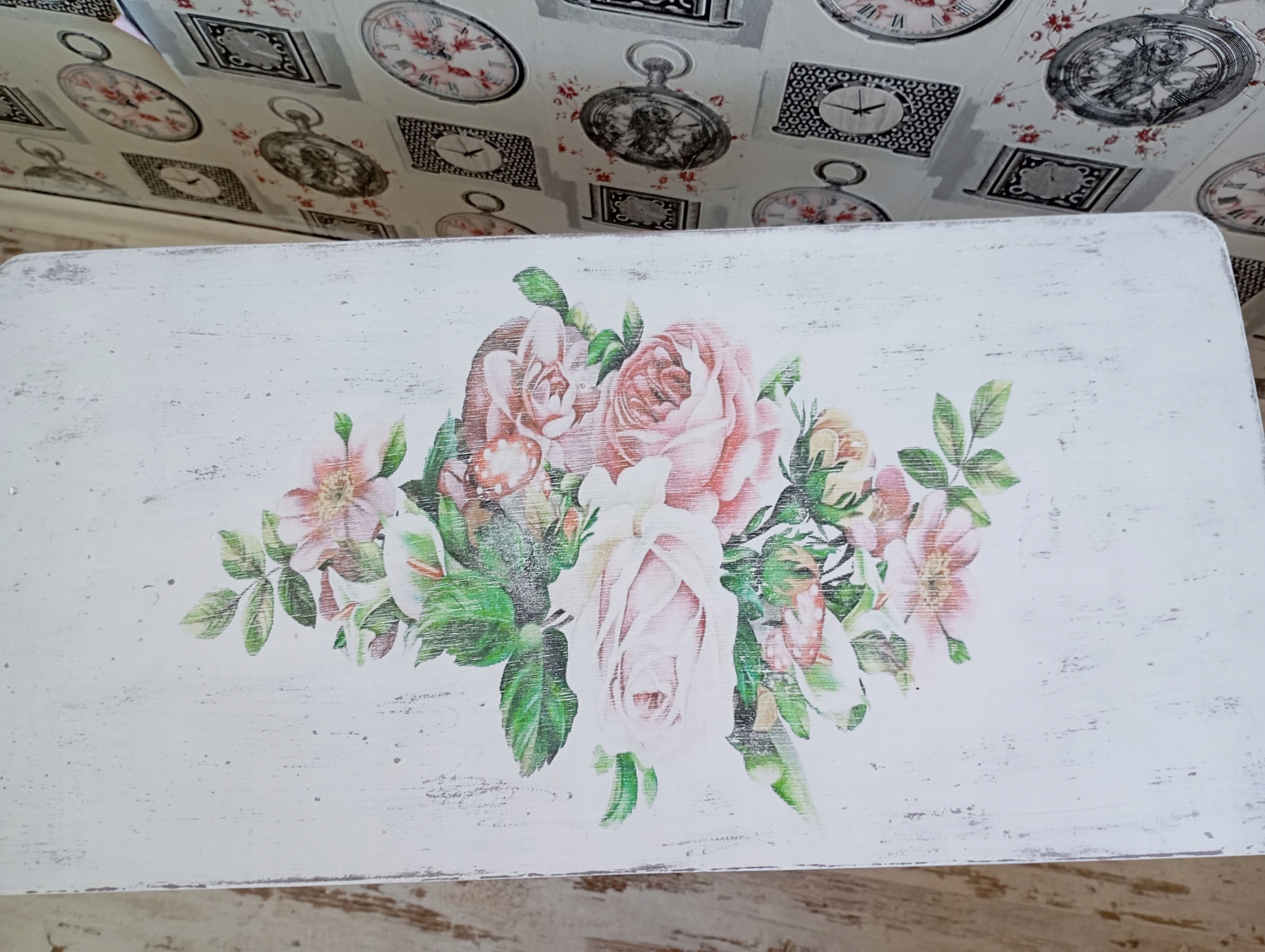 DREWNIANA MALOWANA ŁAWKA ZE SCHOWKIEM KWIATY SHABBY CHIC