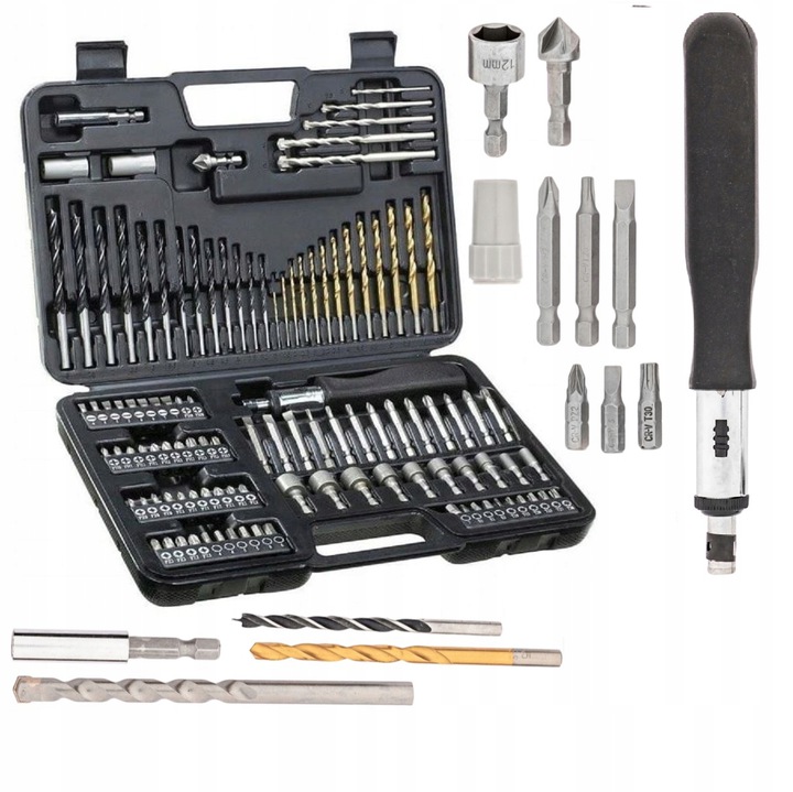 В ТОМ ЧИСЛЕ ВЫ ПОЛУЧИТЕ НАБОР сверл, бит и отвертку, 109 штук в чемодане