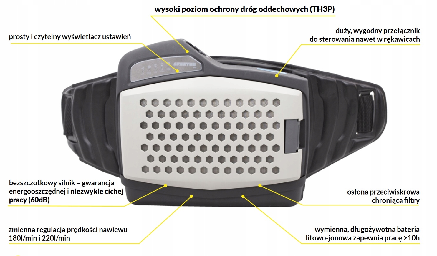 Spartus® Pro Airflow - это гарантия обеспечения чистого и сухого воздуха сварщику в особенно сложных условиях с высоким опылением и влажностью. Высокий уровень дыхательной защиты Th3p обеспечивает набор заменяемых фильтров (основной HEPA, предварительный с активным углеродом), целое защищено анти -масштабным покрытием. Поставка воздуха обеспечивает переменную регулировку скорости выдувания 180 л/мин и 220 л/мин . Все проблемы с потоком сигнализируются системой аварийной сигнализации -акустической сигнализации . Дыхательный шланг соединен с корпусом подковы. Это обеспечивает комфорт и удобство при переезде во время работы.