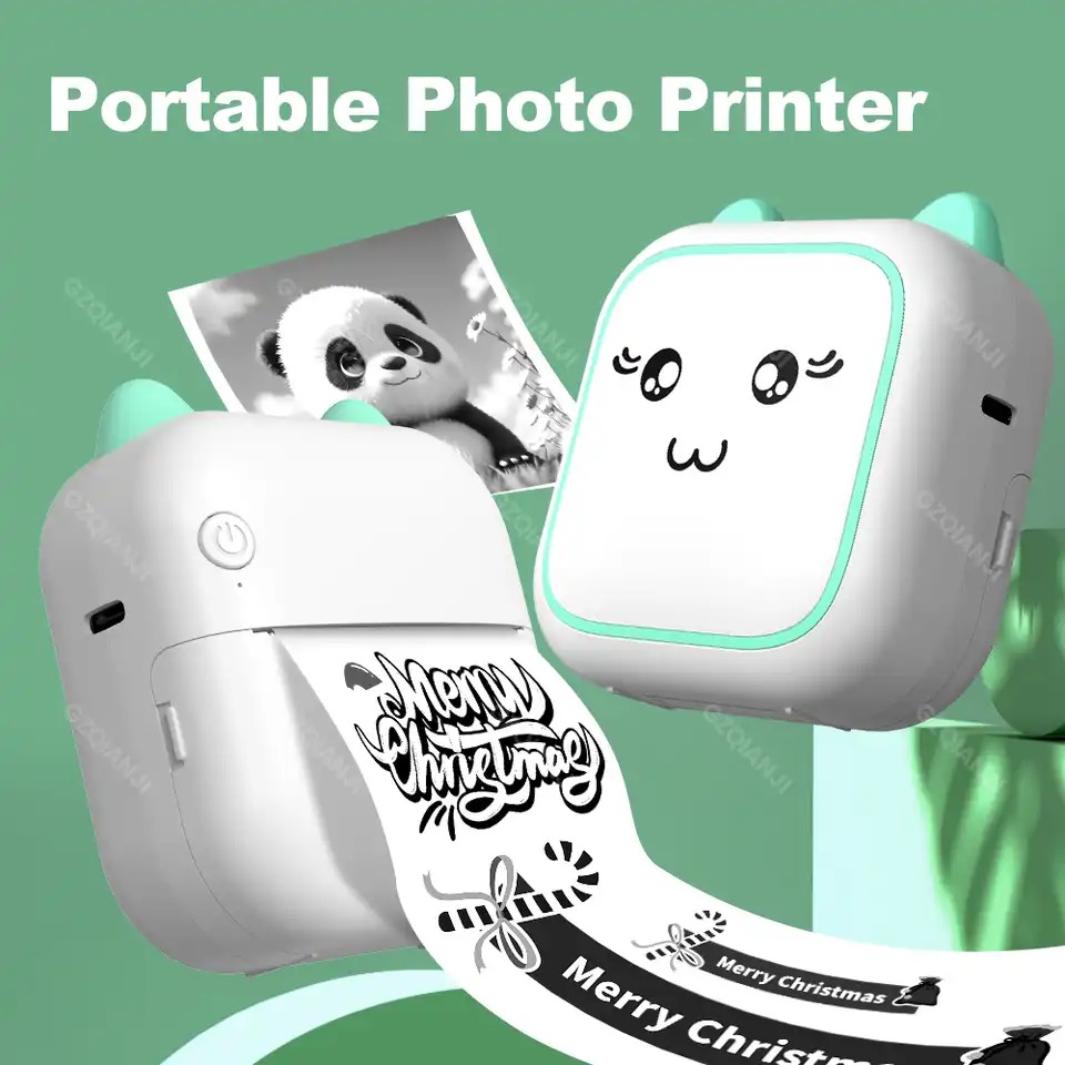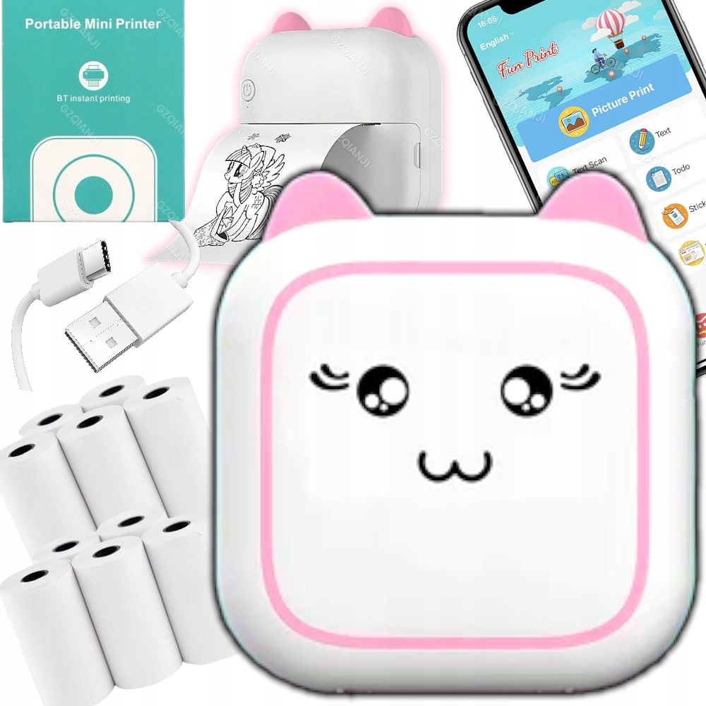 DRUKUŚ МІНІ ТЕРМОПРІНТЕР MINI CAT ДЛЯ ФОТОГРАФІЙ НАКЛЕЙКИ + 11 ШТ РОЛІКІВ