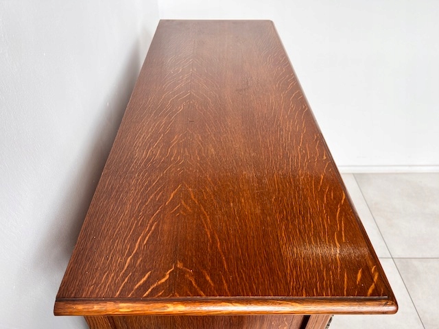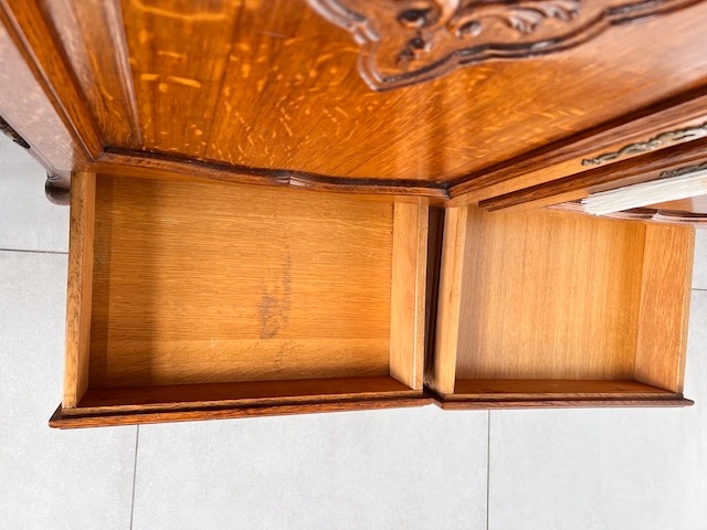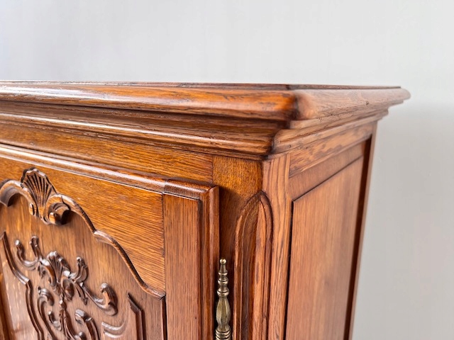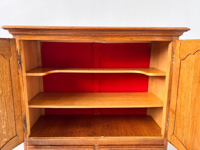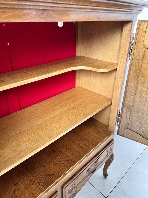 Дубовый бар в стиле Людвик. В целом он в хорошем состоянии, но имеет следы использования. На столешнице есть небольшой след, вероятно, от воды. На нижней части комода темные пятна. Внутренняя задняя стенка покрыта красной фольгой. Замок функциональный, в комплекте есть ключ. Готово к вставке.