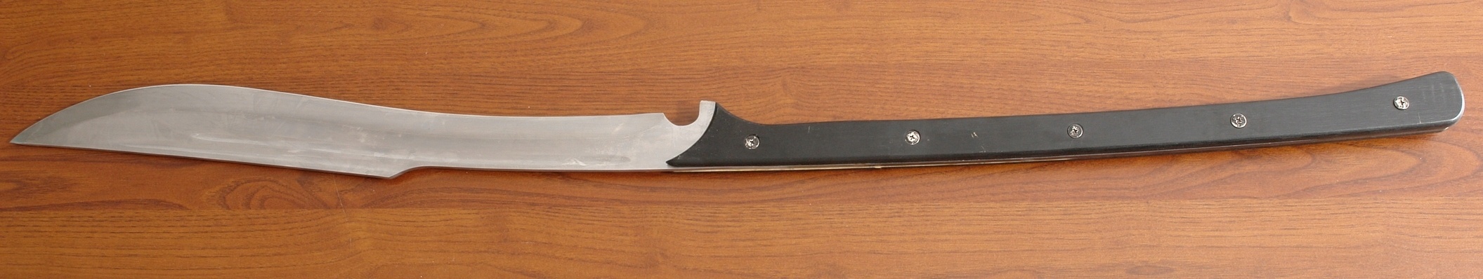 - Сталь среднего крыла вручную (углеродистую сталь AISI 1060) с двойными двусторонними злаками, очень острые. Нитонахаты (облицовка может быть заменена, потому что они не являются навсегда прикованными), лезвие прочно встроено по всей длине ручки. Чтобы открутить облицовка. Ручка). Лезвие в самом широком месте около 60 мм