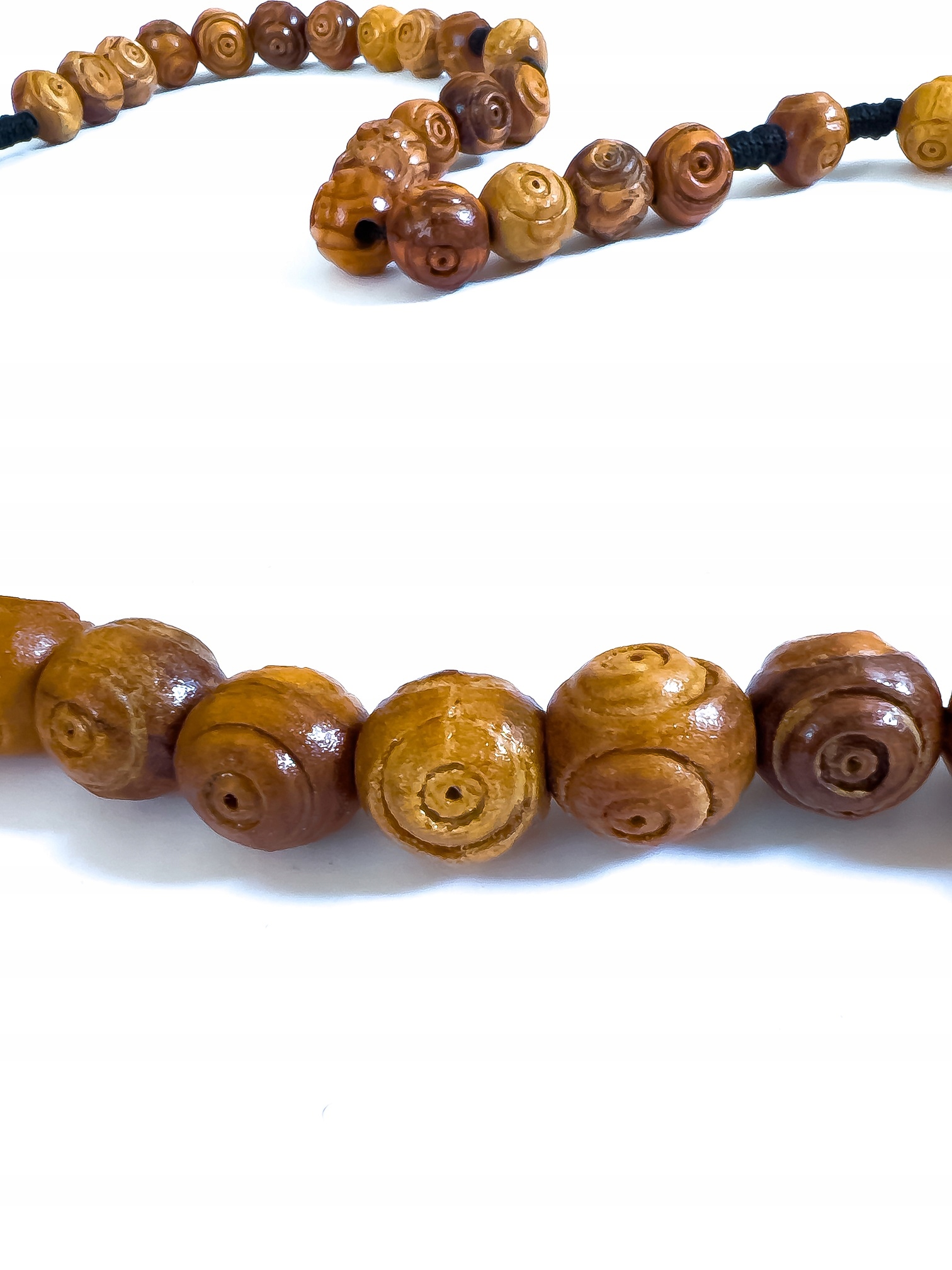 Каждая бусина вырезана вручную, что делает каждую четку уникальной: не существует двух одинаковых частей, поскольку они сделаны вручную. Бусины наплетены на прочную толстую нить.