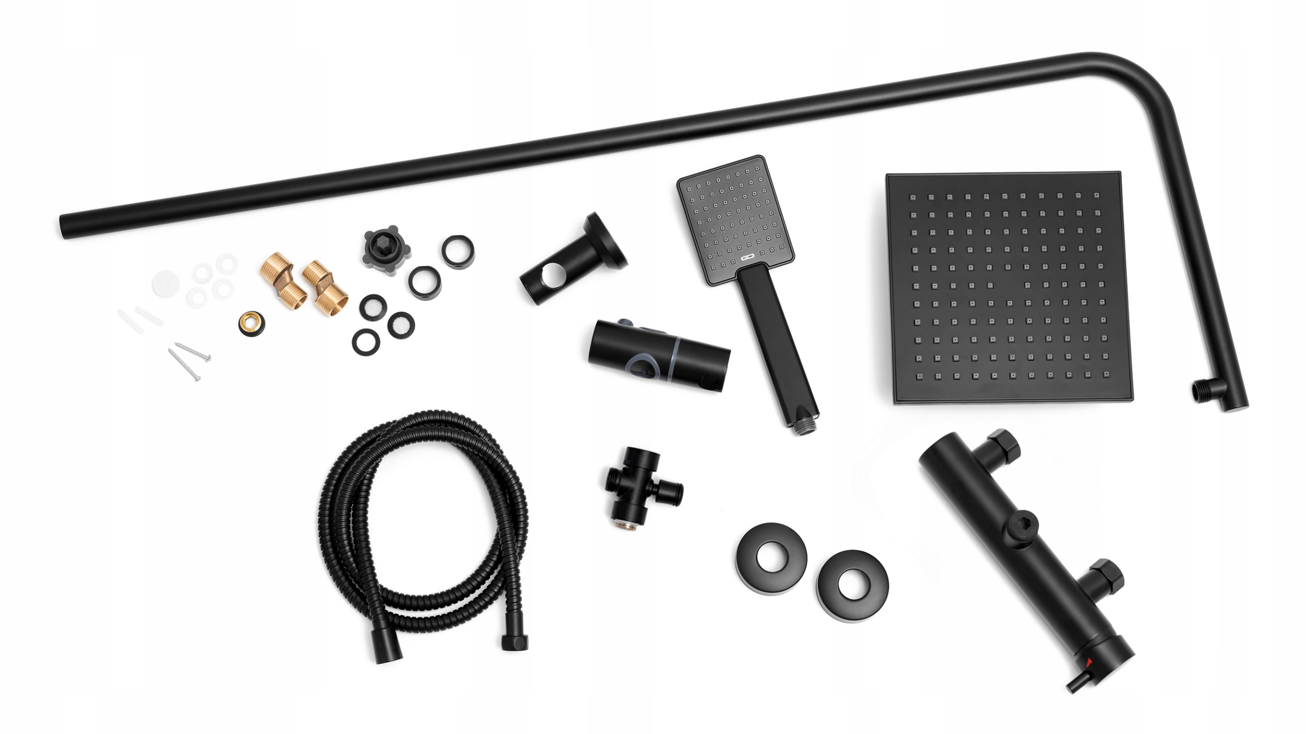 В комплект входит механический смеситель для душа с регулировкой расхода, смеситель температуры и напорный переключатель расхода воды между тропическим душем и трубкой. В комплект входит стильный тропический душ SLIM 20 x 20 см и матовая черная насадка для душа – оба элемента оснащены современной системой ANTI-CALC. Дизайн комплекта адаптирован к последним тенденциям – он выглядит чрезвычайно элегантно и идеально вписывается в современную ванную комнату.