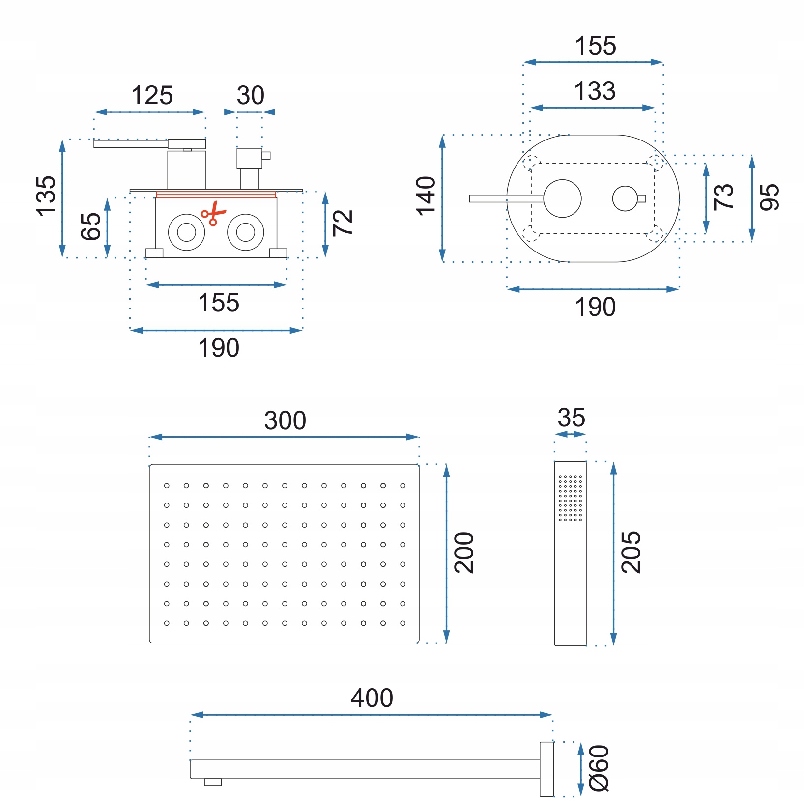 В комплект входит тонкий прямоугольный тропический душ 20х30 см, смеситель с накладными и скрытыми элементами, шланг с металлической насадкой и точечный набор.