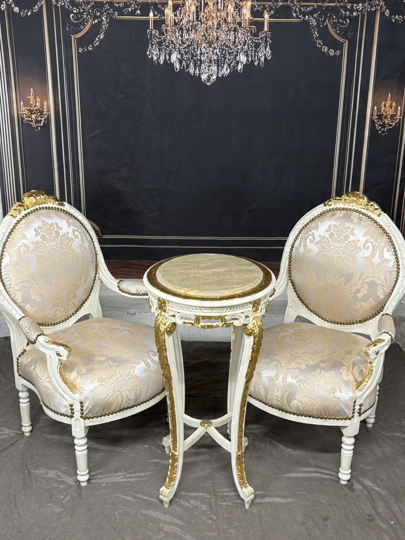 Введите немного аристократического стиля в свой интерьер благодаря этому уникальному набору двух сидений в стиле барокко . Их элегантная бежевая обивка с богатым рисунком отлично подходит с тонкими золотыми деталями , создавая мебель, которая улавливает глаз и добавляет уникальный характер в интерьер.