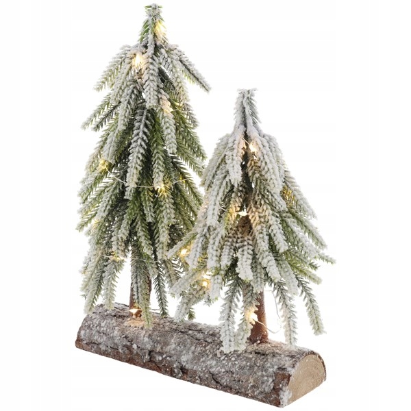 Два очаровательных деревца, покрытые искусственным снегом, размещены на куске дерева. Украшение этими заснеженными елками делает ее завораживающей своим видом, красивой и атмосферной благодаря светодиодной подсветке.