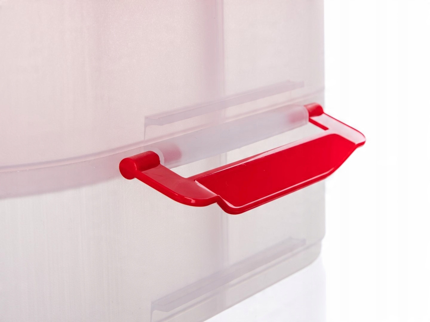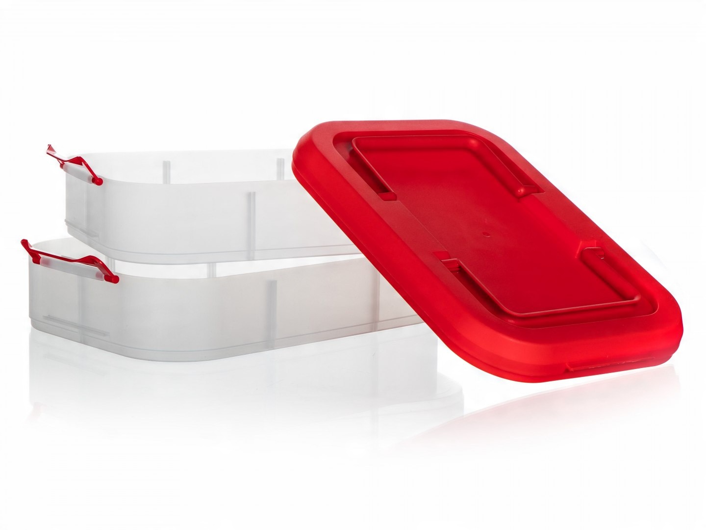 - ПАРАМЕТРЫ: 1x Транспортный контейнер // Общие размеры: примерно 40 x 28 x 18 см // Размеры одного уровня Размер: примерно 40 x 28 x 8 см // Объем: примерно 7 литров каждый // Материал: полипропилен // Цвет: белый и красный