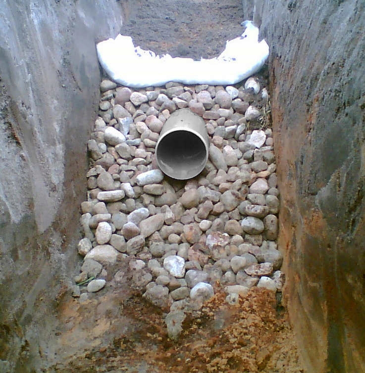Дренаж выполнен из нарезанных труб ПВХ, без прокладок, Ø 110 мм. Это типовые трубы, используемые в строительстве и после соответствующей резки адаптированные для нужд инфильтрации сточных вод.