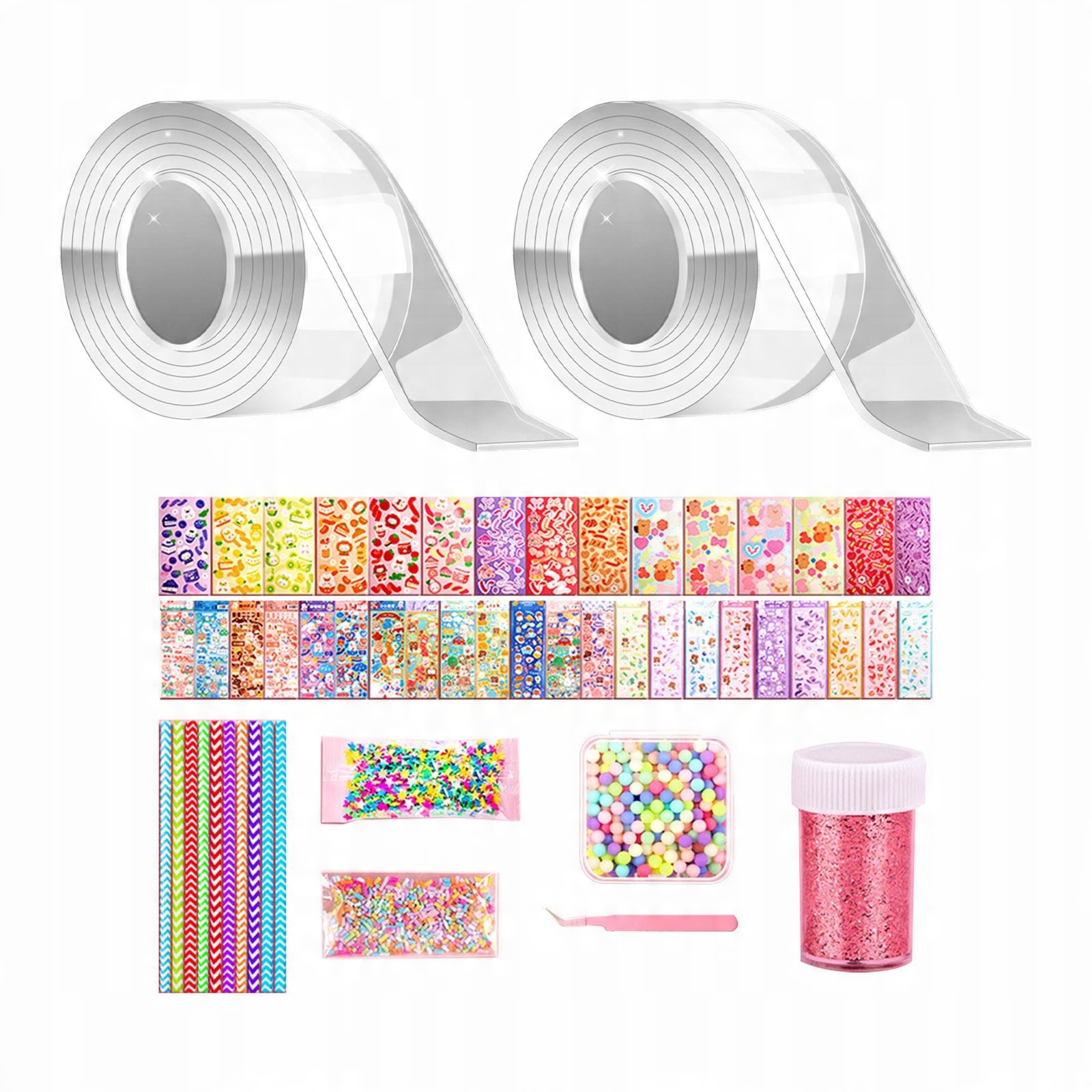 2 рулона скотча, 10 наклеек, 10 воздуходувок, 1 упаковка блесток, 1 упаковка пятиконечной звезды, 1 упаковка сахарных гранул, 1 упаковка бусинок, 1 пинцет