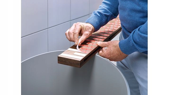 - Наклейте полоски сверхпрочной монтажной ленты tesa® Powerbond вертикально на заднюю часть изделия.