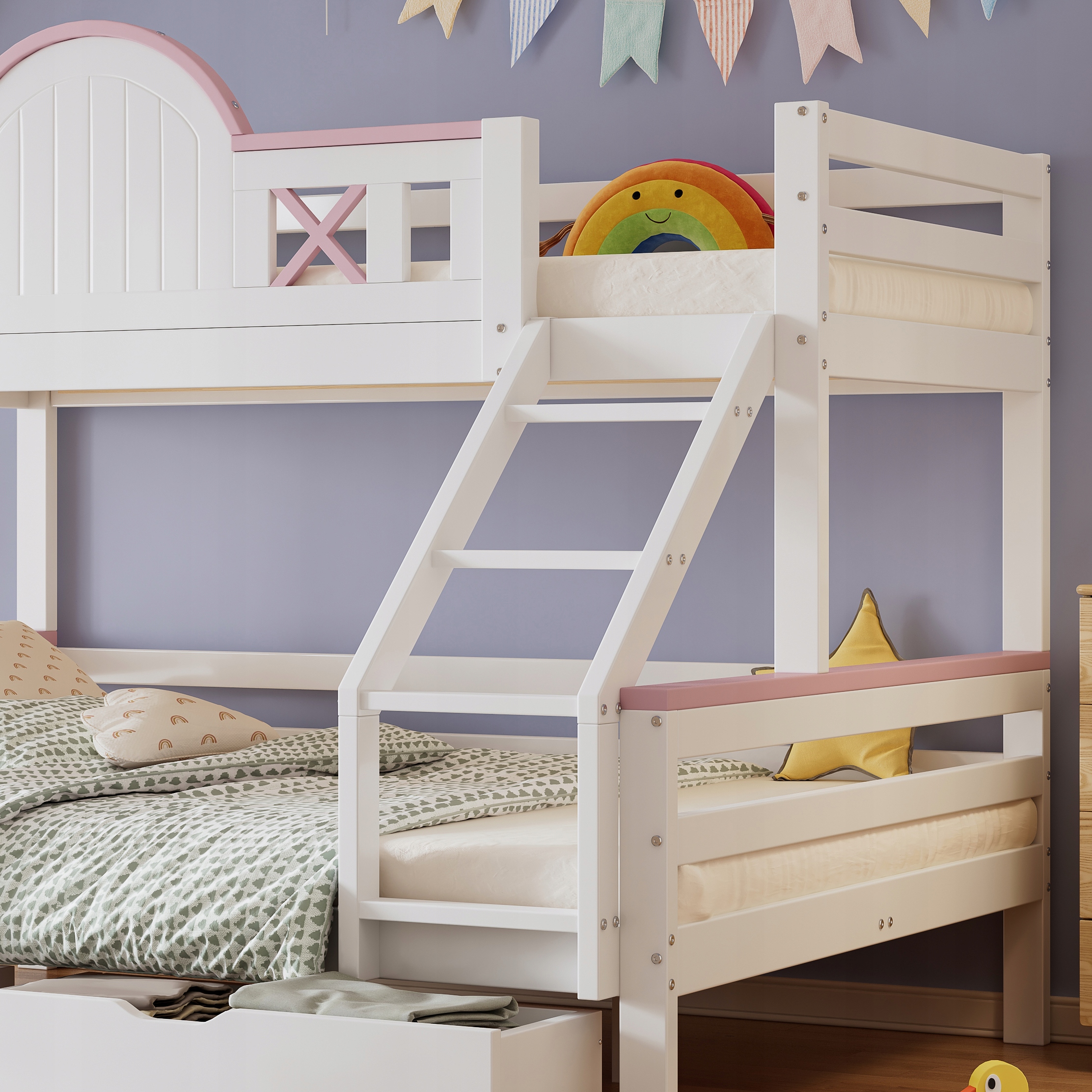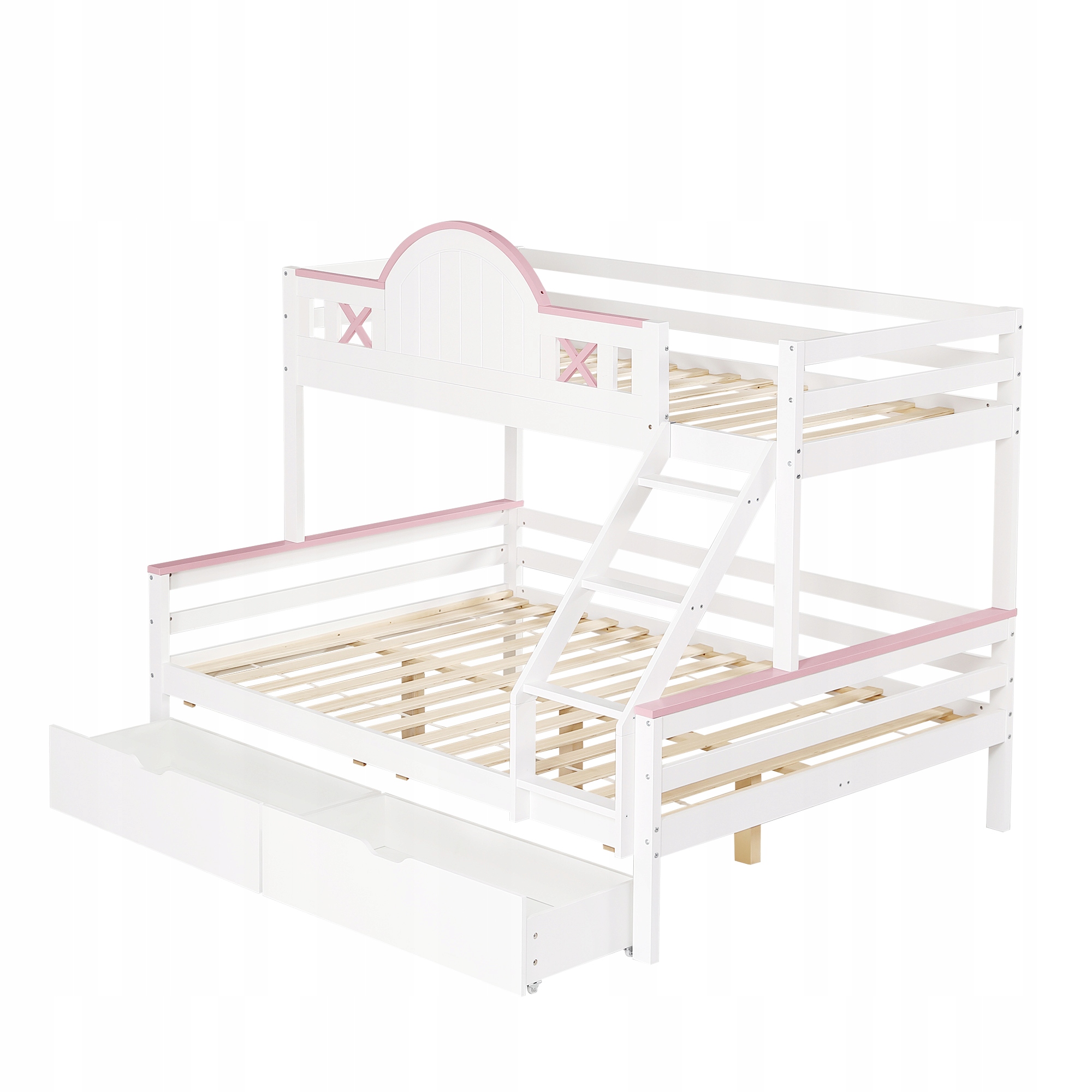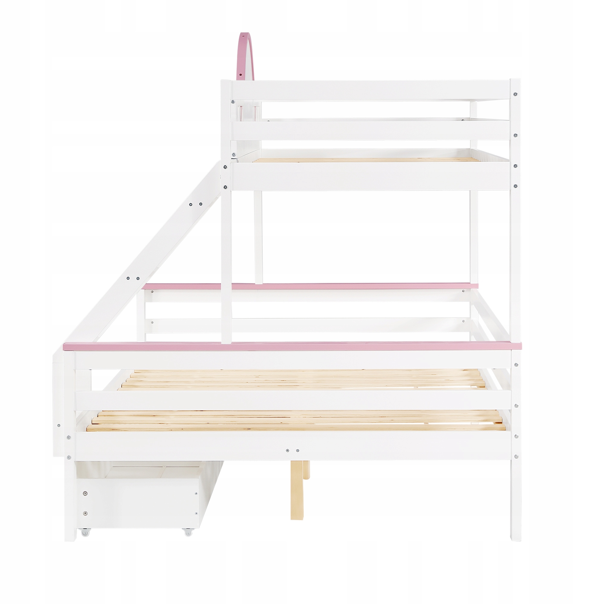 двухъярусная кровать, детская кровать, с барьером, защищающим контрастным цветом, двумя ящиками, с окном, с четырехскоростным наклоном с лестницей, уникальной формой окна, сосны+MDF, белый+розовый, 90x200 см и 140x200 см