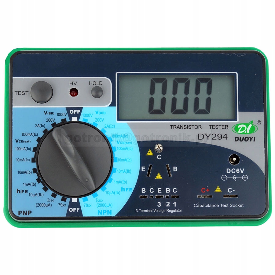 Douyi -это тестер и счетчик основных параметров полупроводниковых элементов: биполярные транзисторы PNP и NPN, транзисторы FET, полупроводники, конденсаторы, 3 -х рыночные линейки из 78xx и диоды. 79xx series. Метр DY294 предназначен для опытной электроники, которая хочет выполнить тестовые и измеренные параметры, парные транзисторы и т. Д. Из -за высоких значений испытательных напряжений, превышающих более 1000 В на некоторых диапазонах, он не предназначен для начинающих любительских электронных без опыта. При использовании тестера DY294 должны соблюдать все метрологические правила.