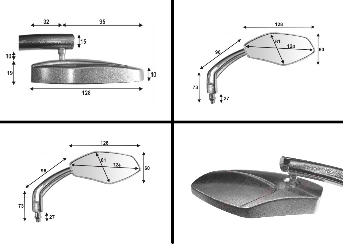 Это универсальные зеркала. Они подходят для всех мотоциклов с винтовым креплением М10 и правой резьбой с обеих сторон. Головка и ножка зеркала изготовлены из прочного пластика, шарнир и крепление — из стали. Все зеркало покрыто толстым слоем серебристой краски.