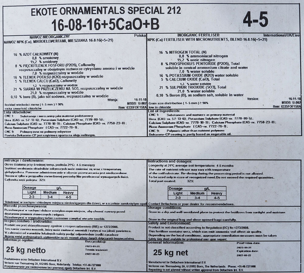 Ekote Ornamentals Special NPK удобрение для полевых древесно-кустарниковых питомников