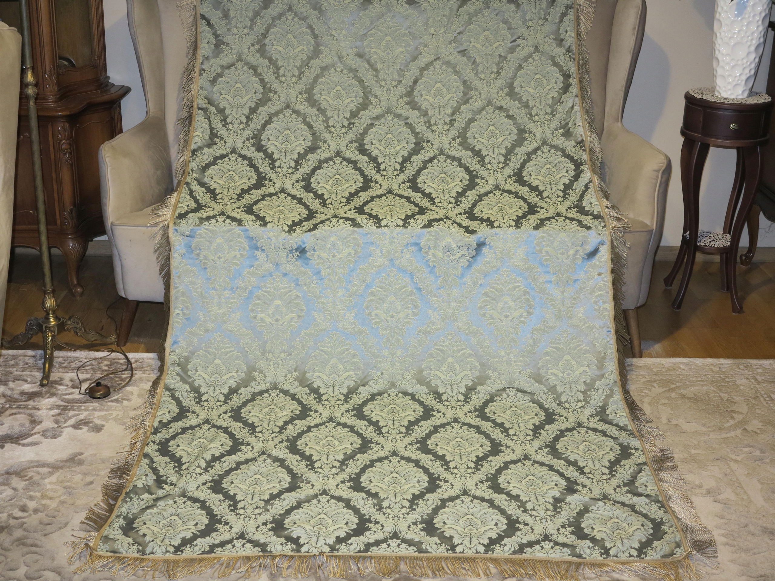 Эксклюзивная и чрезвычайно красивая огромная скатерть от высококачественной хлопковой жаккардовой в парижском синем, в схеме Акантуса. Украшены золотыми полосами