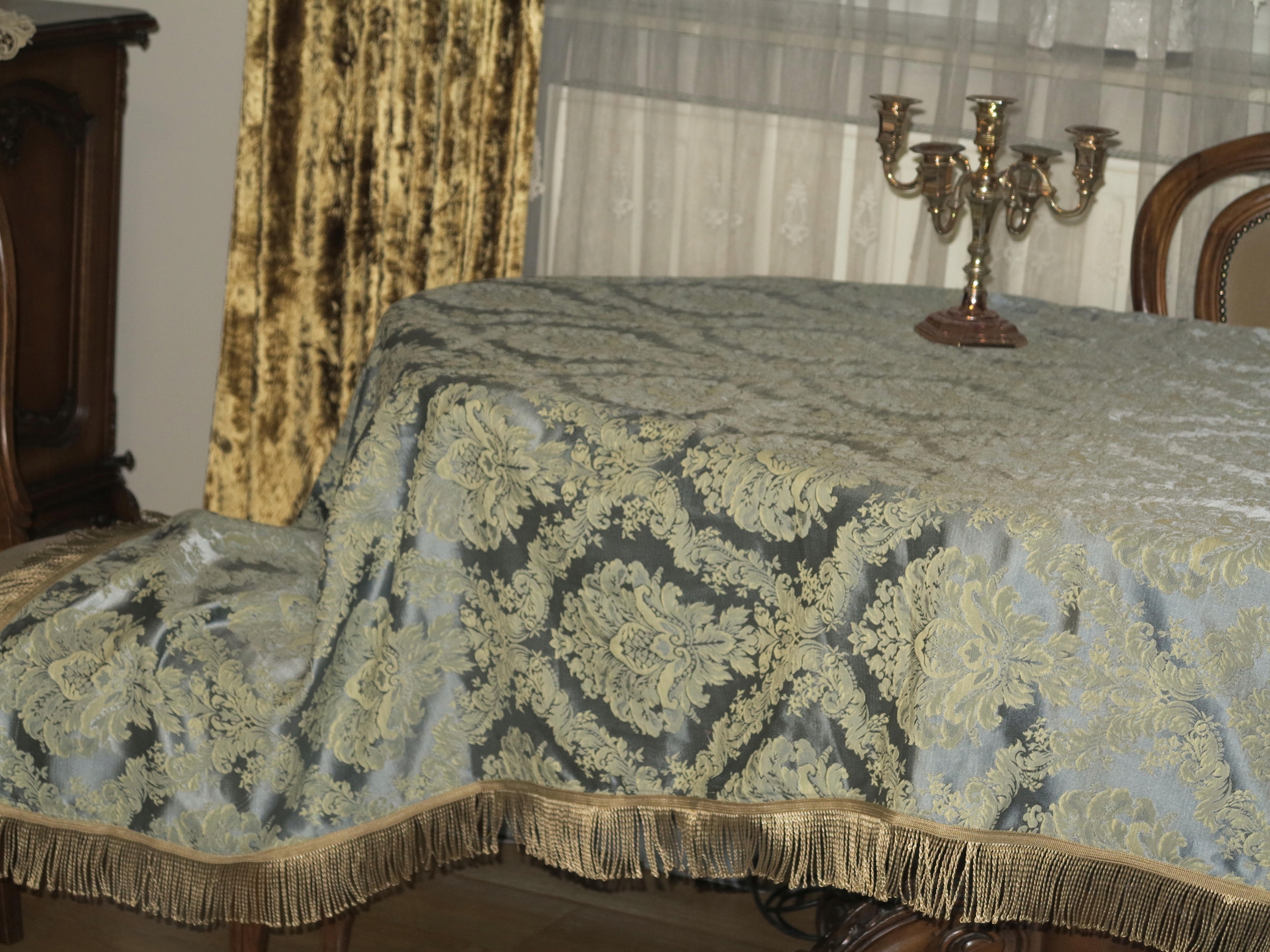 Эксклюзивная стильная скатерть в парижском синем, акант рисунок/Fringes 241/132+7