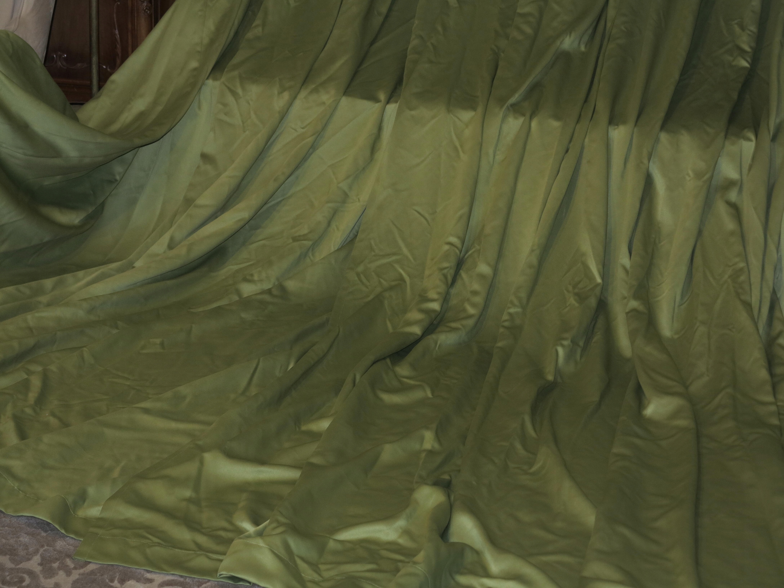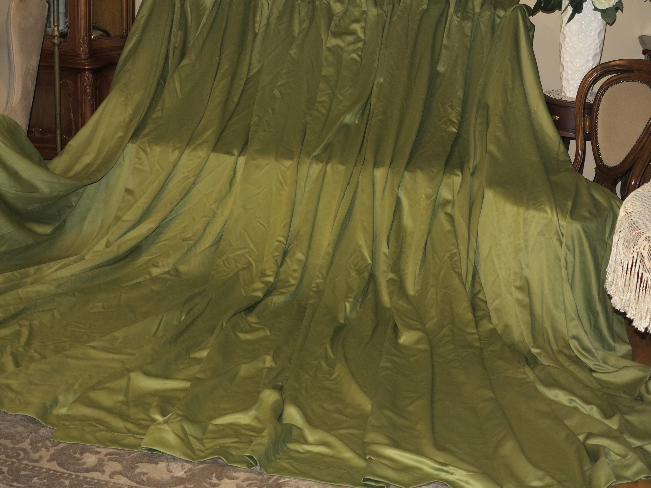 Эксклюзивный и чрезвычайно красивый набор высоких и очень широких штор в стильном зеленых. Занавески от «тяжелого» и мясистого синтетического атласа. Занавески красиво и образуются. Для эксклюзивной гостиной (более темные тени на цвете штор - это просто ошибка камеры, шторы без какого -либо обесцвечивания)